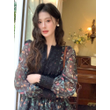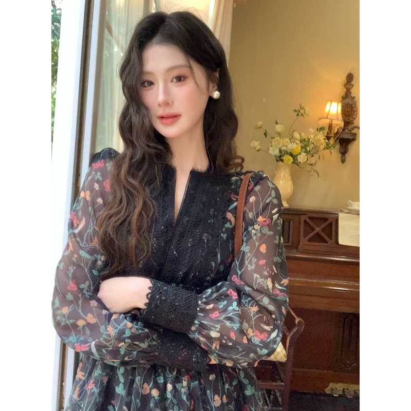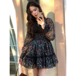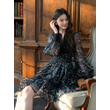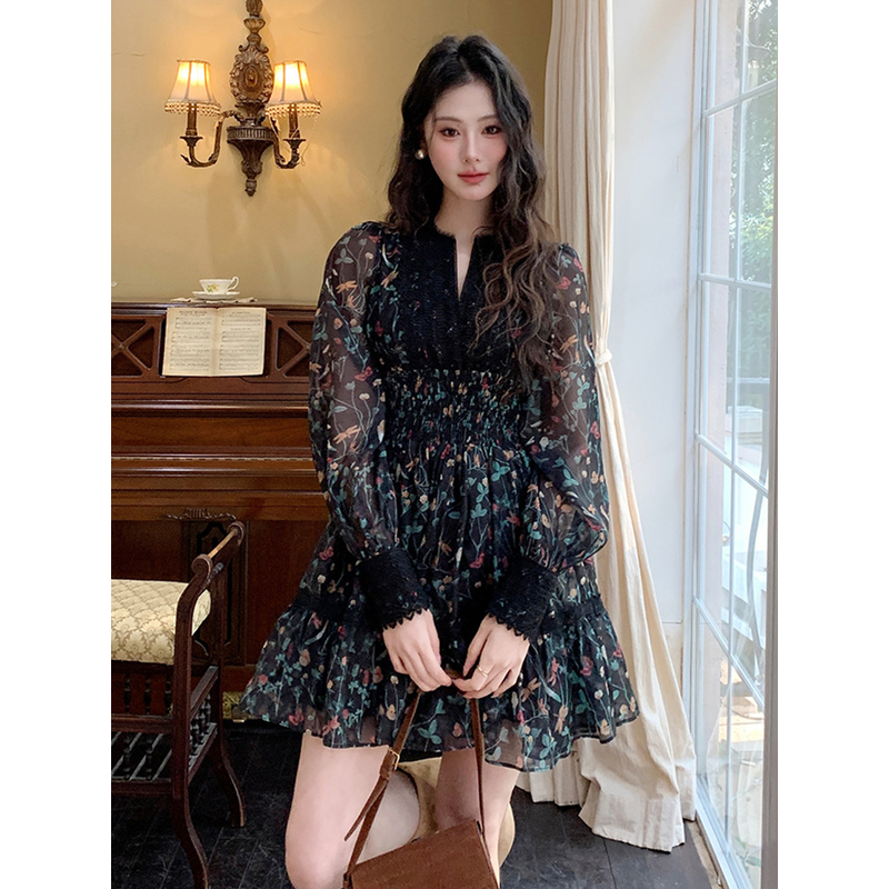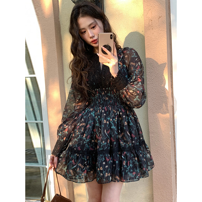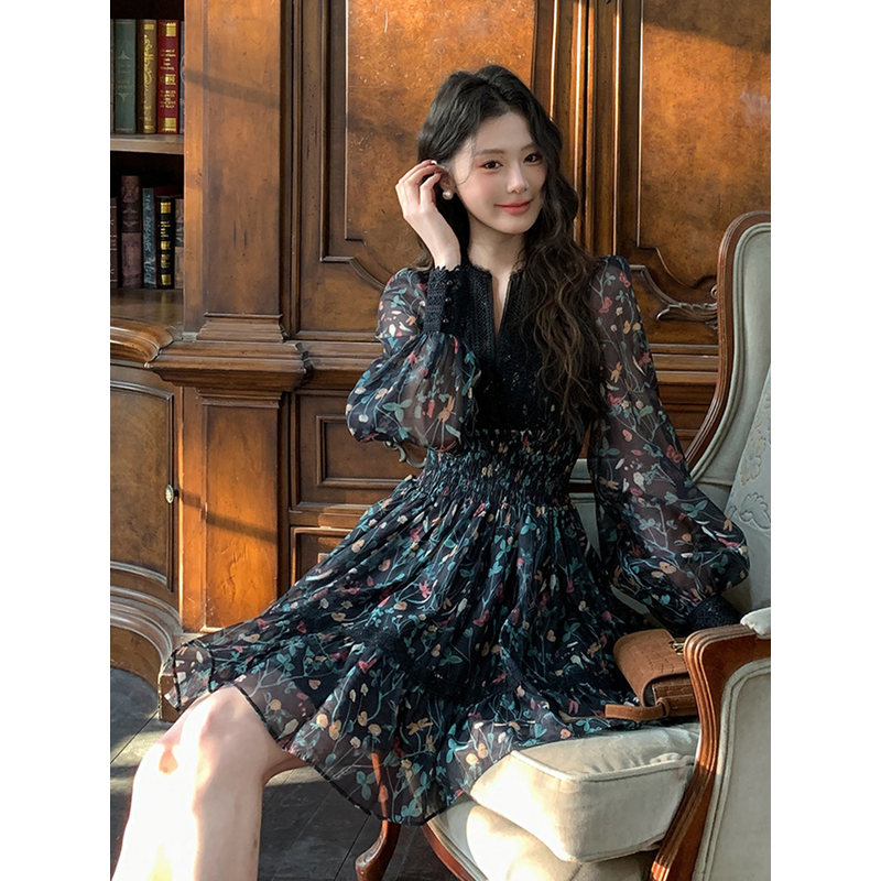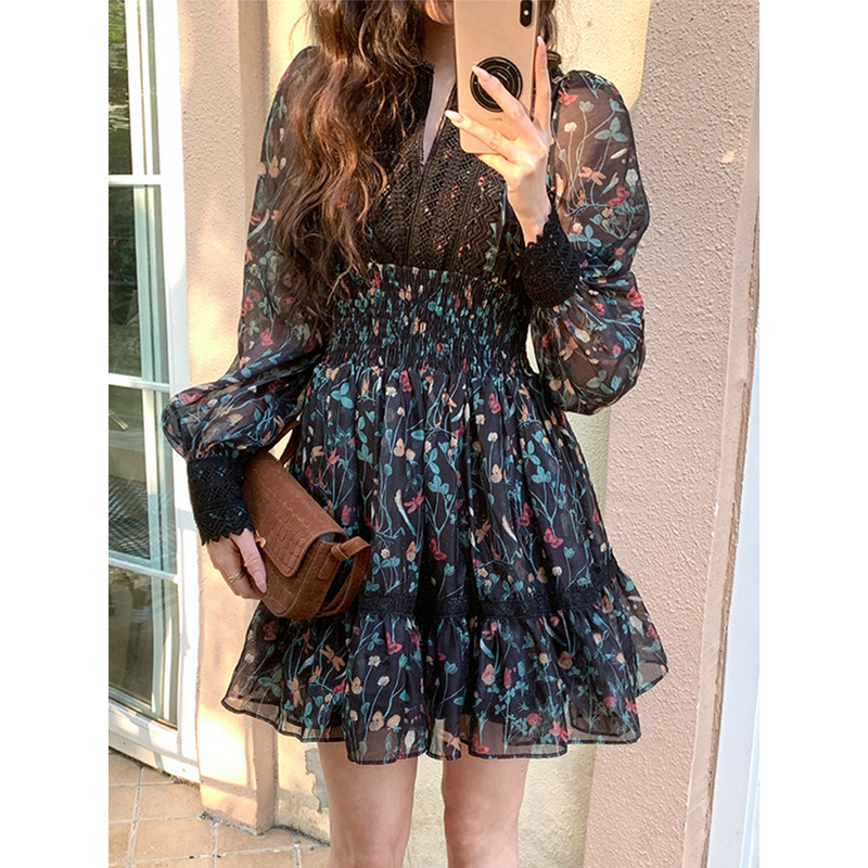 French Style Fashionable Retro Dress Women Cute Print Lace High Waist Ball Gown Lady Coffee Break Street Vestido Holiday Clothes
