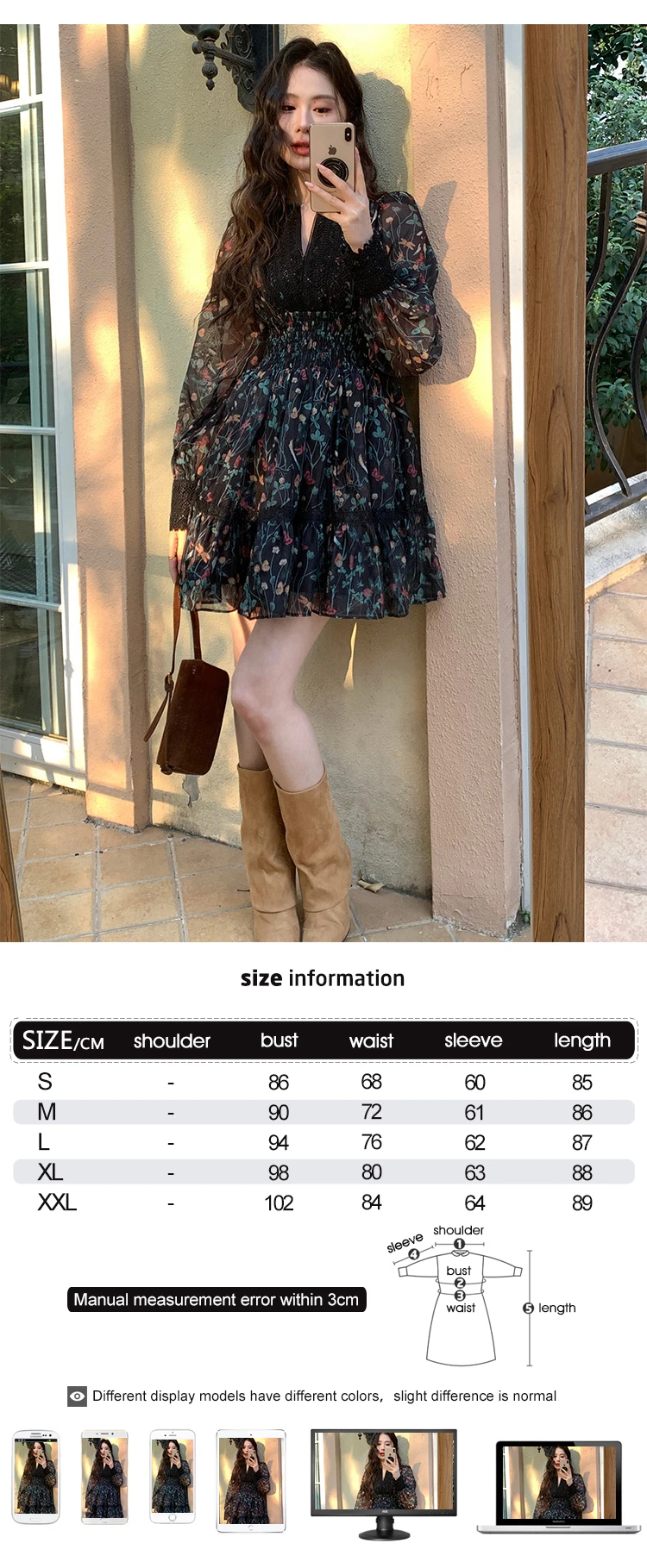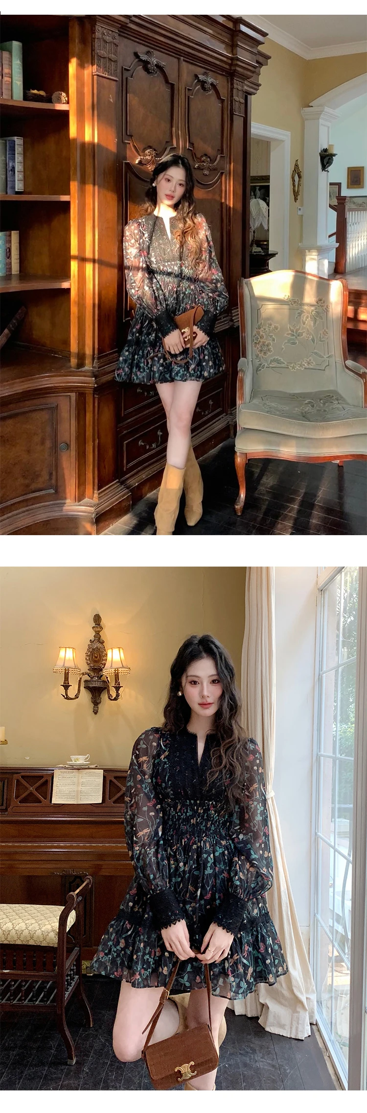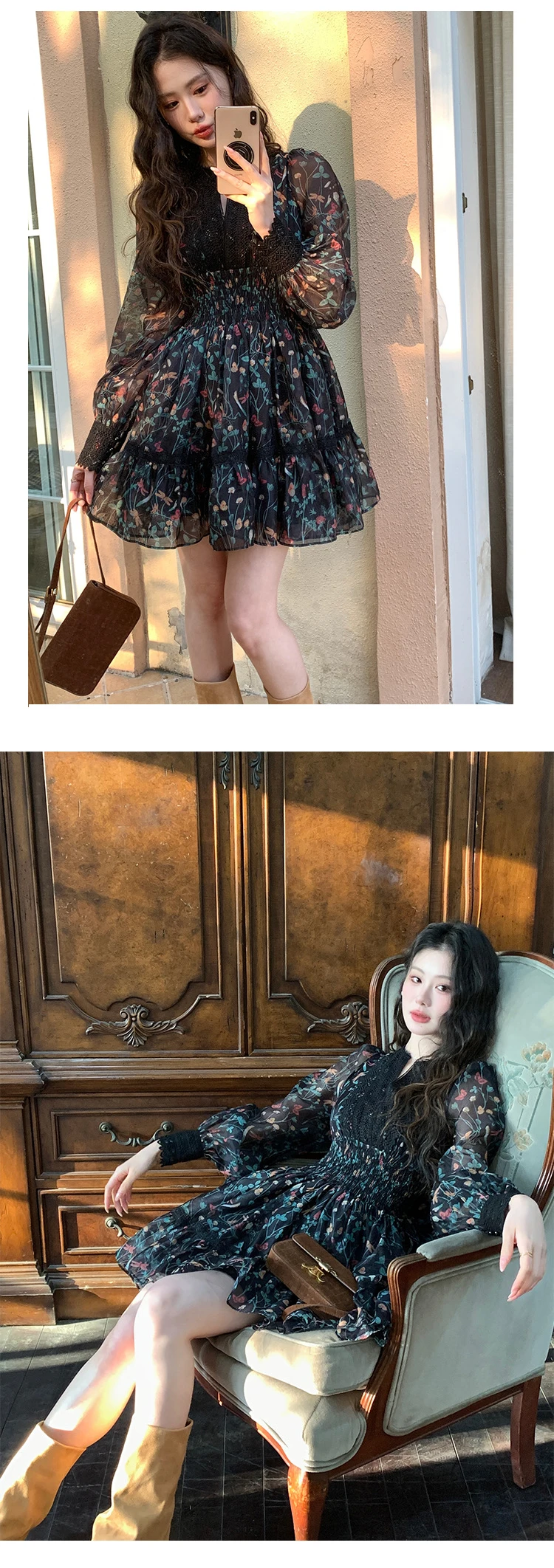 French Style Fashionable Retro Dress Women Cute Print Lace High Waist Ball Gown Lady Coffee Break Street Vestido Holiday Clothes
