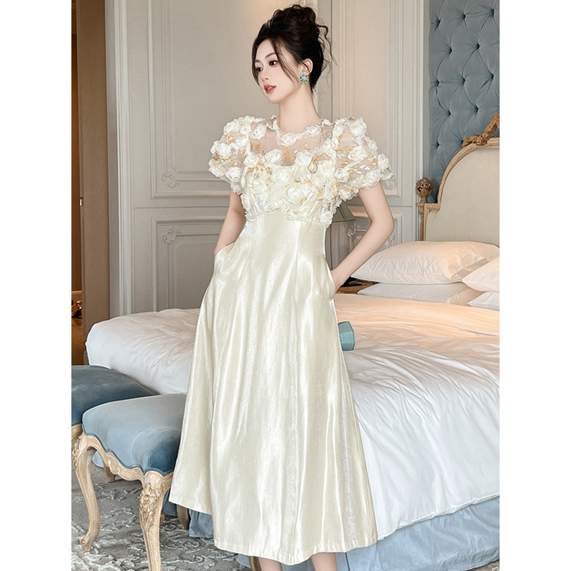 French Sweet Long Dresses for Women Gorgeous Sheer Rose Pockets Swing Robe Birthday Party Runway Vestidos Prom Gown