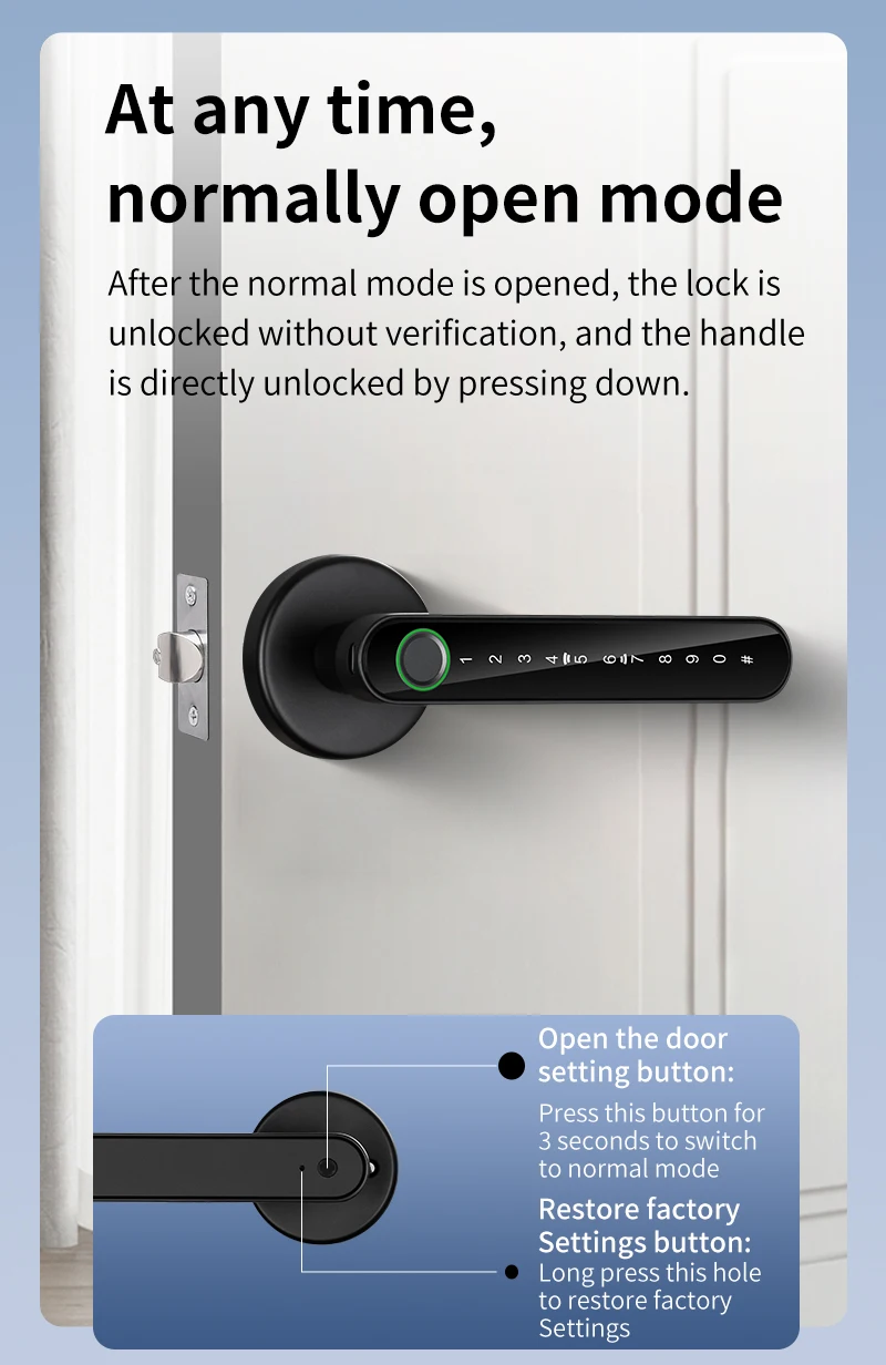 After the normal mode is opened, the lock is unlocked without verification, and the handle is directly unlocked by pressing down.