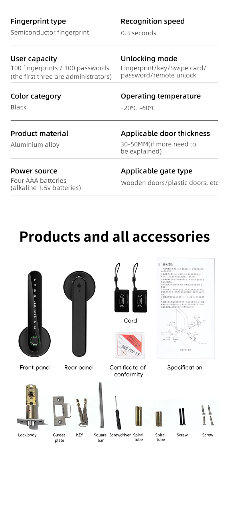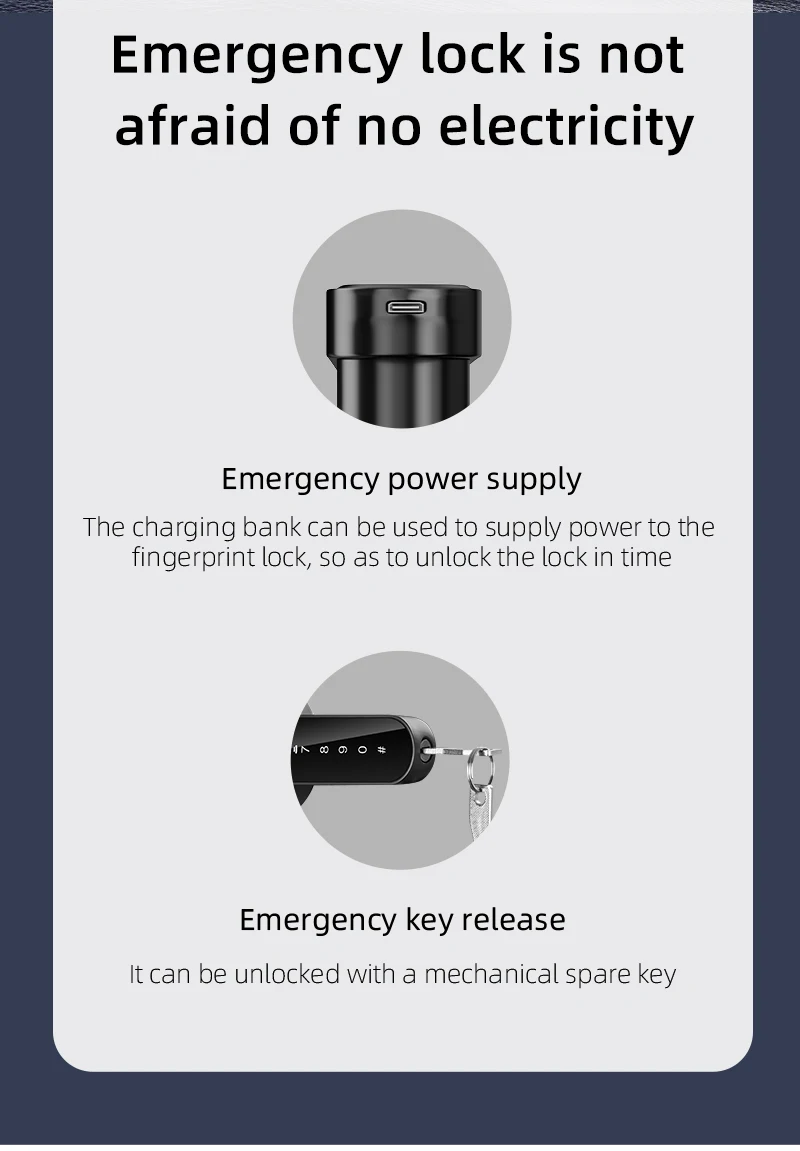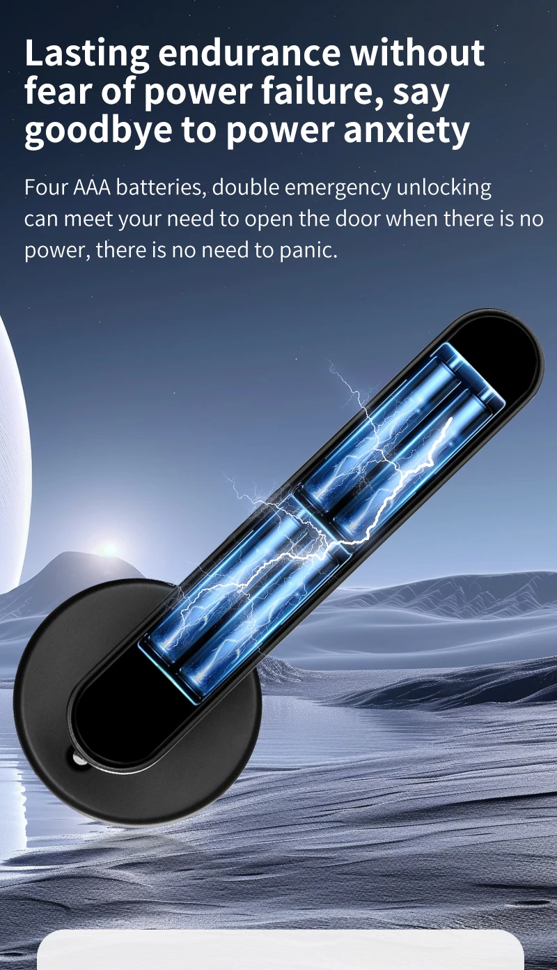 Four AAA batteries(Package does not include batteries.), double emergency unlocking ,can meet your need to open the door when there is no power, there is no need to panic.