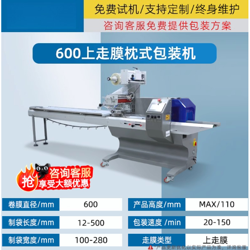 Product description:Fully Automatic Horizontal Flow Pack Machine Pillow Packaging Equipment for Biscuits Snacks Food