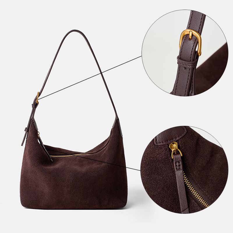 This rich chocolate-brown hobo bag exudes cozy sophistication, crafted from luxuriously soft suede that adds a warm, tactile charm to any outfit. Its slouchy yet structured silhouette features a slim, adjustable leather shoulder strap (finished with polished gold hardware) for customizable comfort, while the smooth gold-toned zipper ensures secure access to the roomy interior—perfect for stowing daily essentials.
