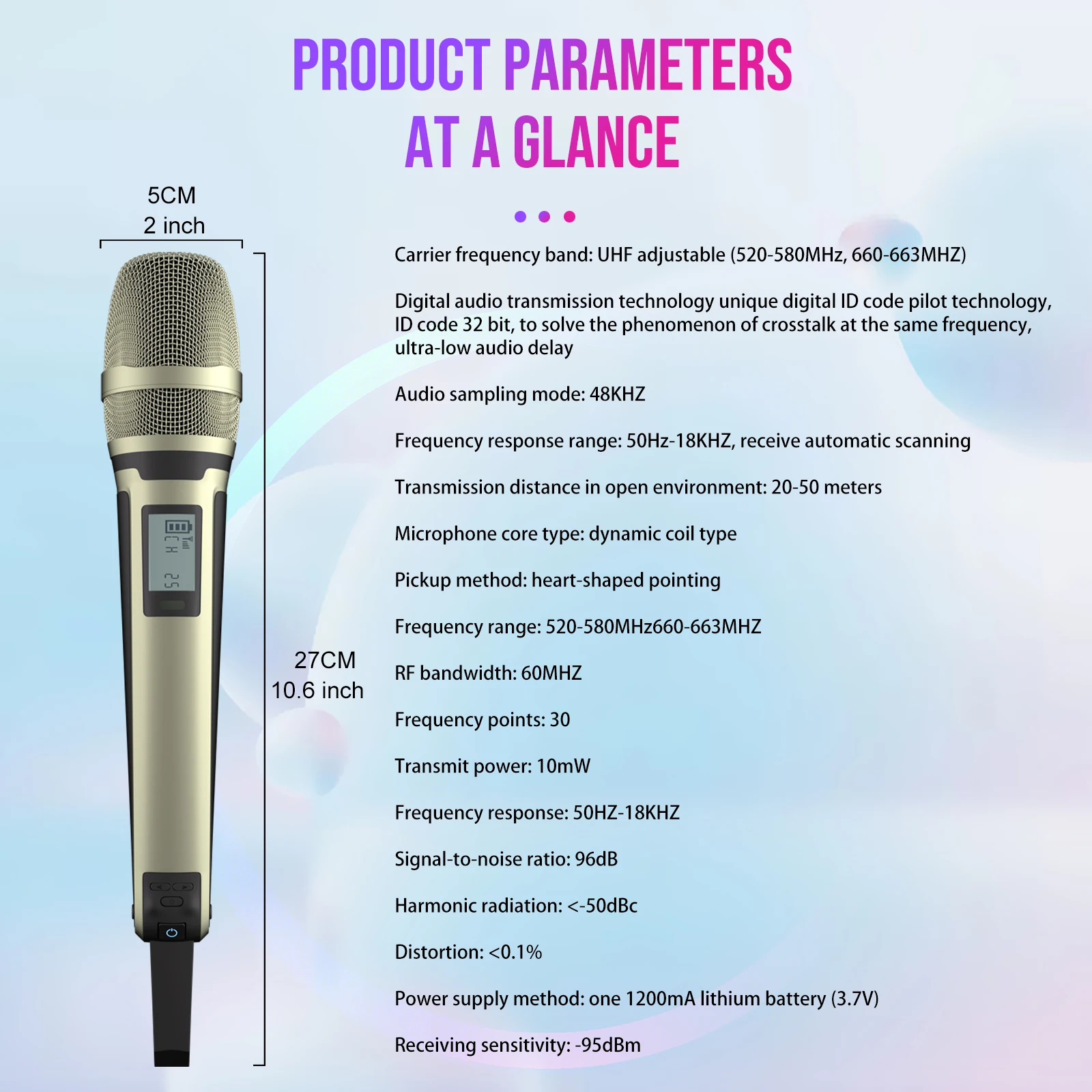 • Adjustable Frequency :This microphone features an adjustable frequency, allowing for optimal sound quality and performance in different environments.