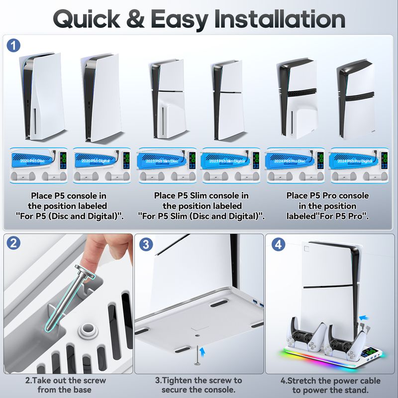 The fan pulls out hot air from the bottom of console and efficiently dissipate heat from side, ensuring that PS5 console stays cool without noise, enhancing your gaming experience.
