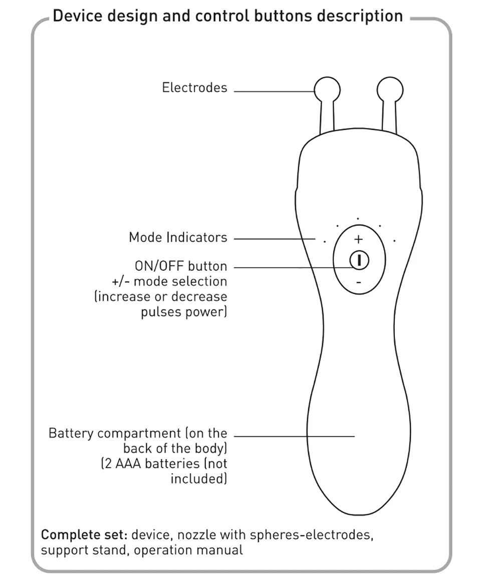 It is easy-to-use and convenientin service,wireless,battery operated(not included),hasa compact and stylish design. Two spheres-electrodesgenerate electric current, a Convenient control panel ofthe device is located directly on the body, which allows youto independently adjust the pulses power and there are 5modes of pulses operation in the device. Automatic poweroff isprovided after15 minutes of operation.