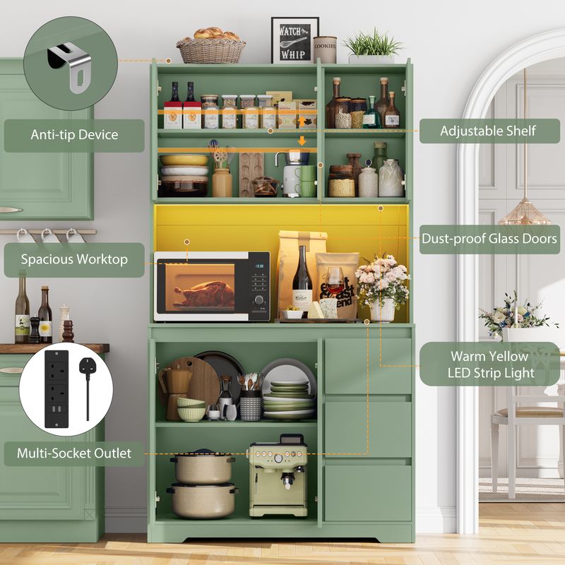 With 6 storage surfaces, 1 spacious working plate 100x38.5 cm, 3 extracts to storage coffee machines, microwaves, etc. and plenty of space for dishes and kitchen utensils.