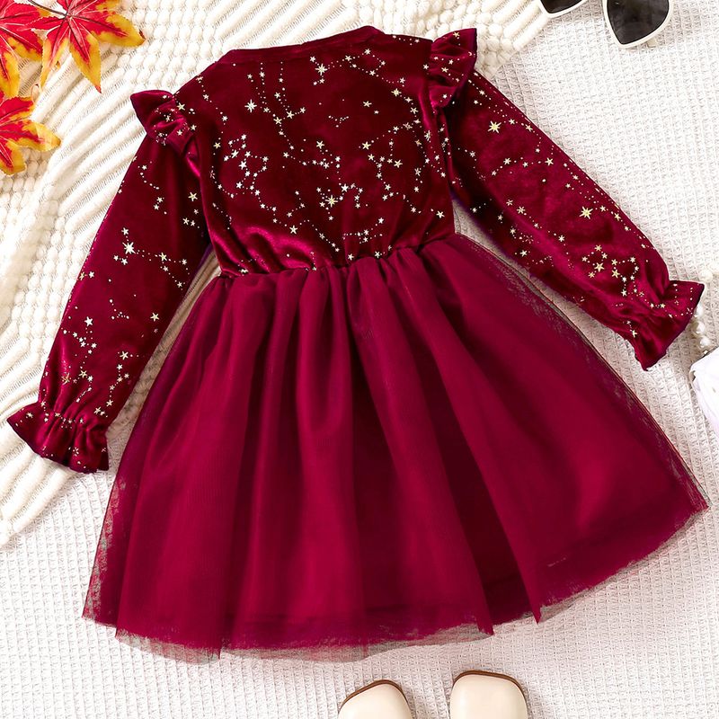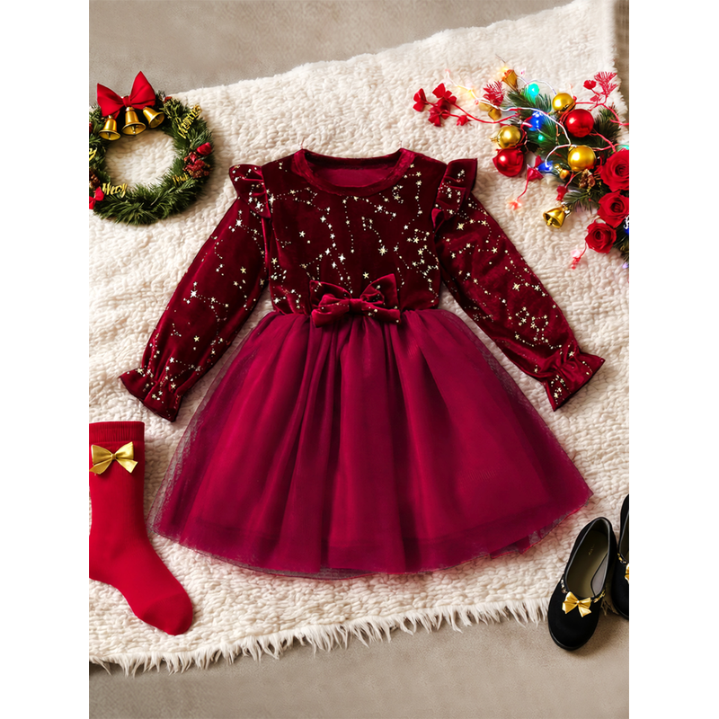 Girl Dress Autumn Winter Velvet Long Sleeved Mesh Bow Princess Dress Children's New Year Children Party Festive Dress For Girl