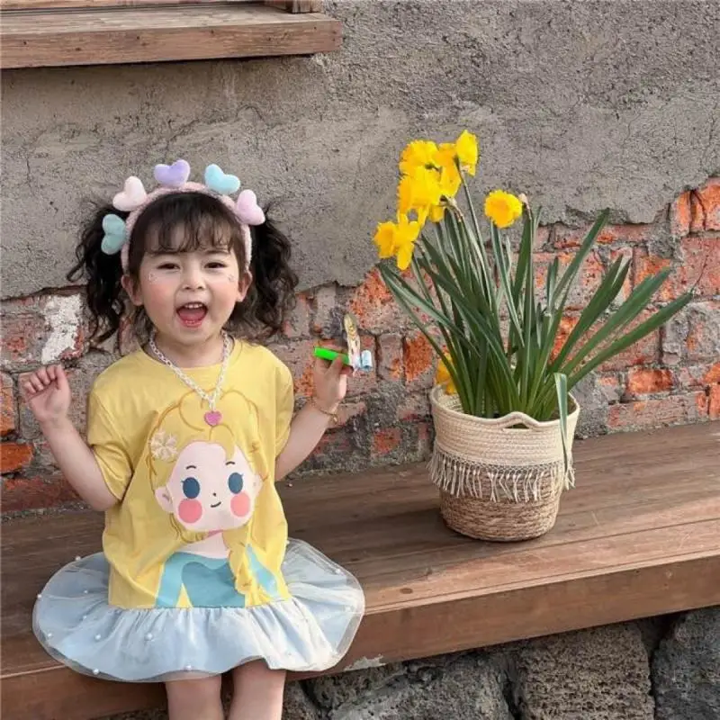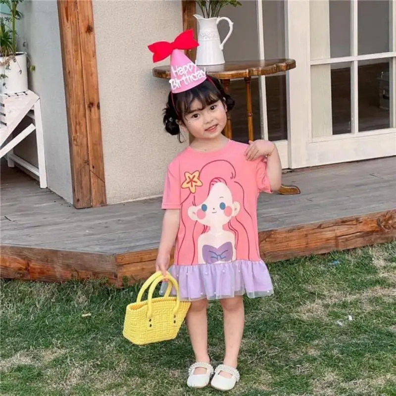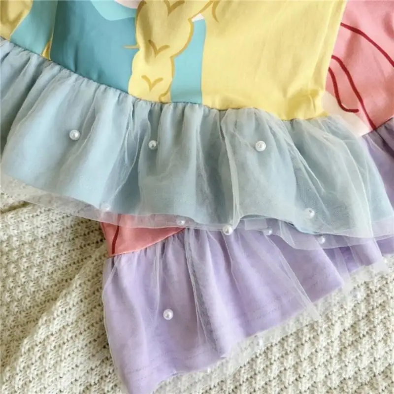Girl's Patchwork Mesh Dress Summer Korean Version Cute Cartoon for Children Clothing Princess Dresses