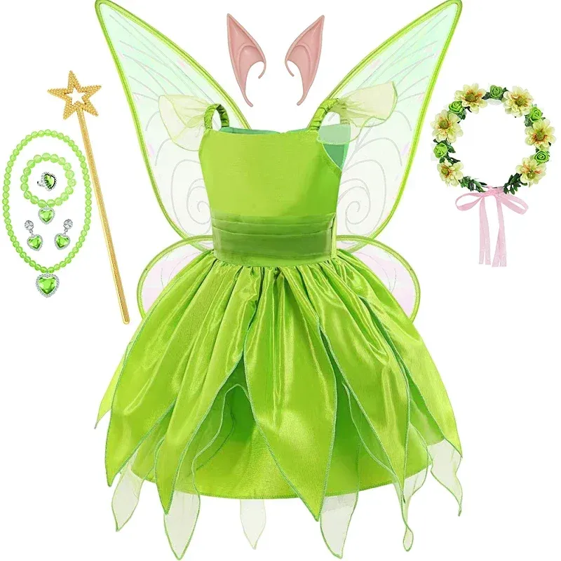Girls Disney Party Dresses Fairy Tiana Costume for Girl Tinkerbell Children Clothing Princess Elf Birthday Ball Gown Wing Dresse