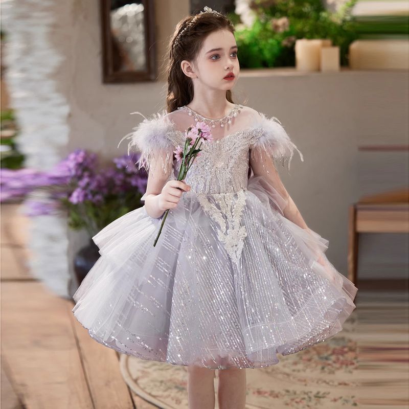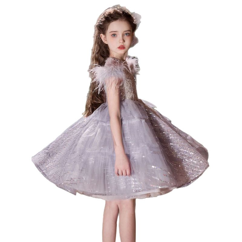 Girls' Dress Children's High-end Affordable Luxury Beautiful Princess Dress Silver Gray Short 150cm