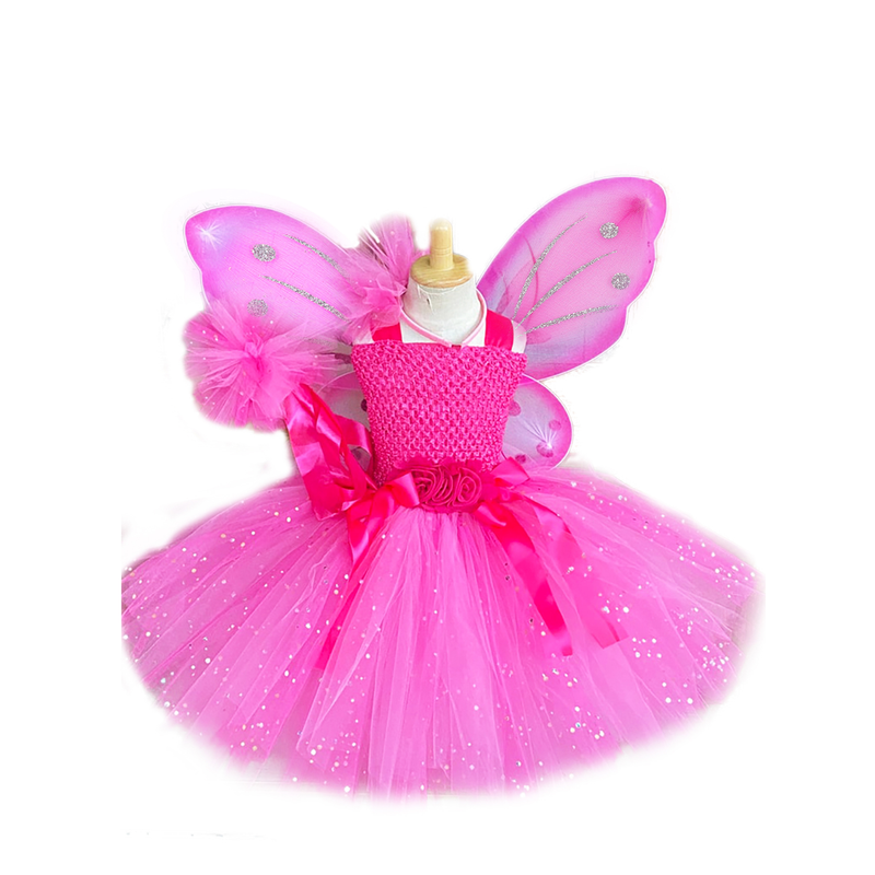 Girls Pink Glitter Tulle Dress Kids Butterfly Fairy Tutu Dresses with Wing and Stick Hairbow Children Halloween Cosplay Costume