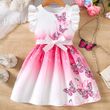 Girls' Spring and Summer Knitted Casual Fashion Round Neck Flutter Sleeve Ruffle Dress with Butterfly Digital Print, Suitable for Holidays, Vacations, Beach, Parties, Gifts