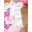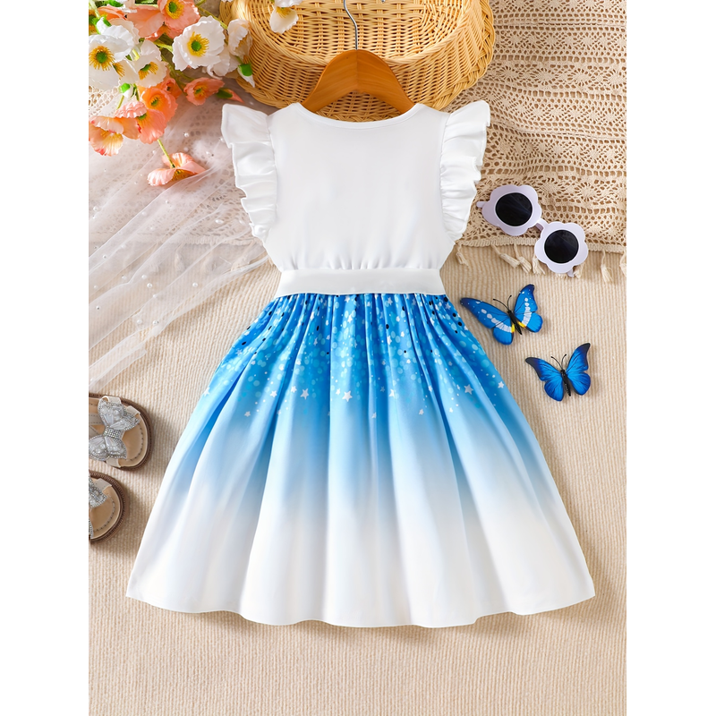 Girls' Spring and Summer Knitted Casual Fashion Round Neck Flutter Sleeve Ruffle Dress with Butterfly Digital Print, Suitable for Holidays, Vacations, Beach, Parties, Gifts