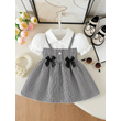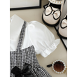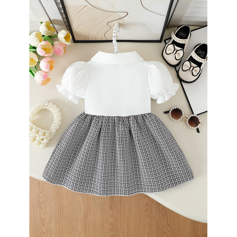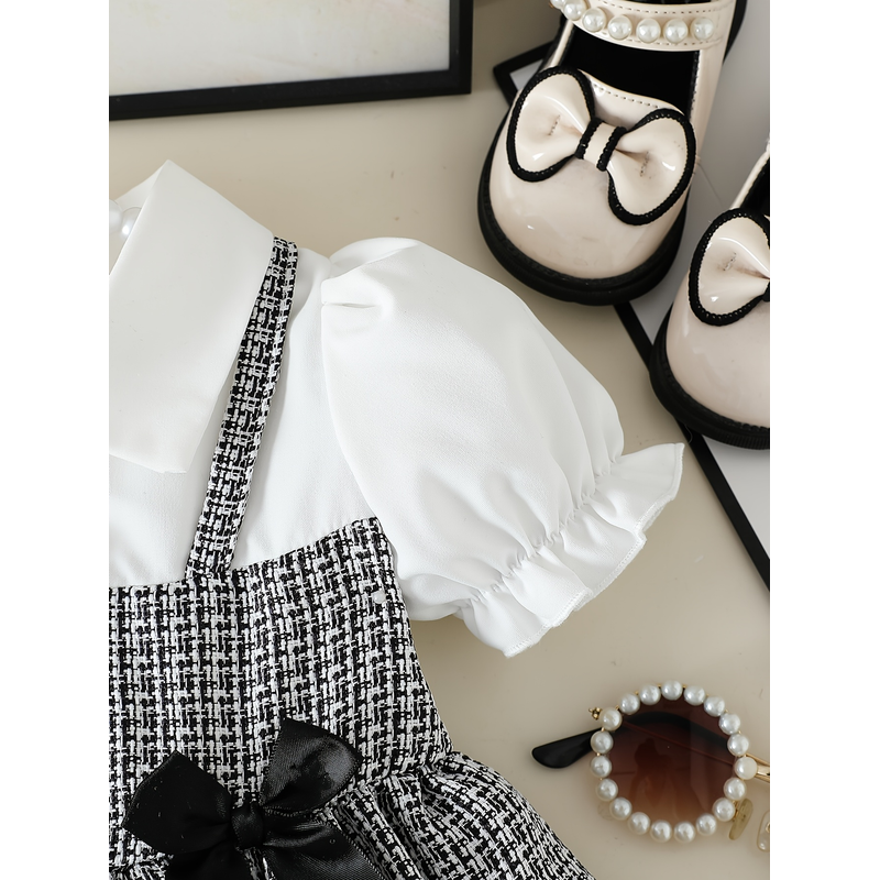 The design uses a faux two-piece set, with the upper part being a white, collarless shirt with puffy short sleeves, and the lower part being a black and white plaid overall dress version with an A-line skirt, which is both refreshing and sweet, and the loose version does not restrict the child's activities.