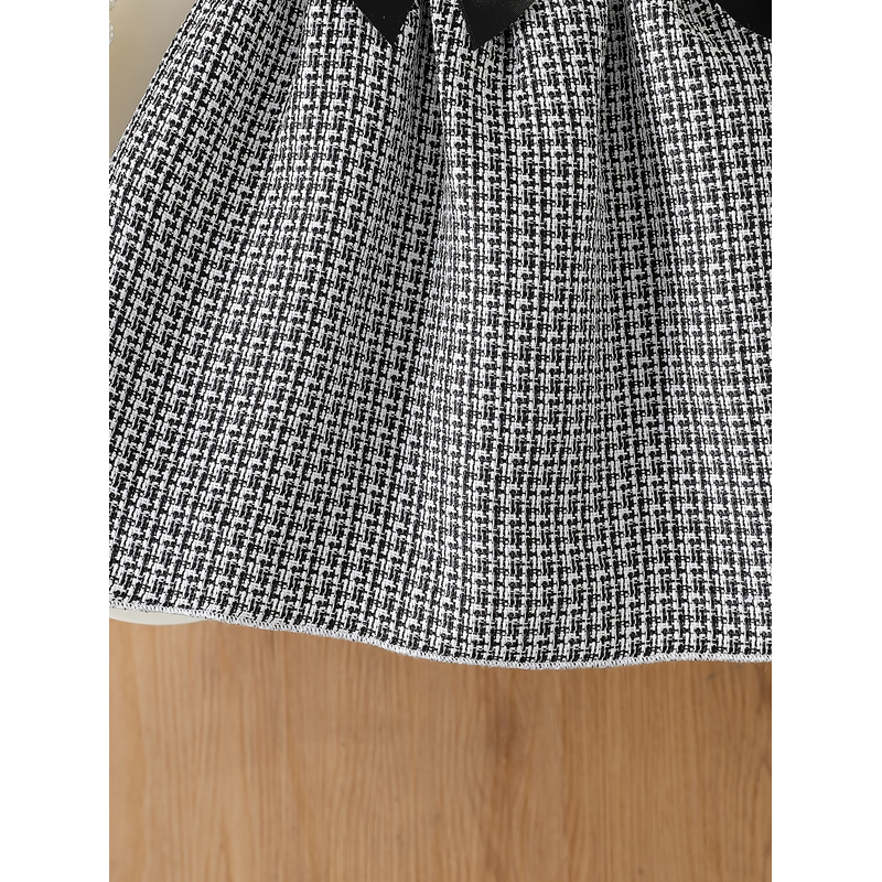The lower part is made of classic black and white Chanel style plaid fabric with a strong texture and a retro, high-end feel, making the dress look more exquisite;