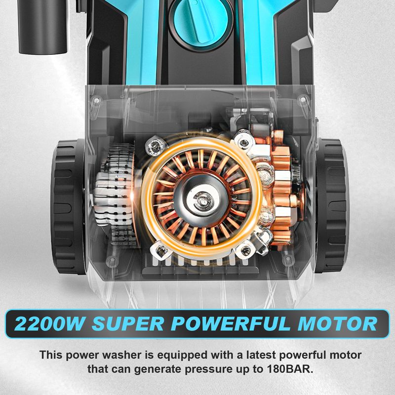 【OUTSTANGING POWER】Powerful2200-WATT motor generates up to 2600PSI of water flow.Powered using an air cooled industrial motor and the power will quickly and effortlessly blast through grime and dirt to restore your surfaces,covering a larger area in a shorter time, making cleaning more efficient.