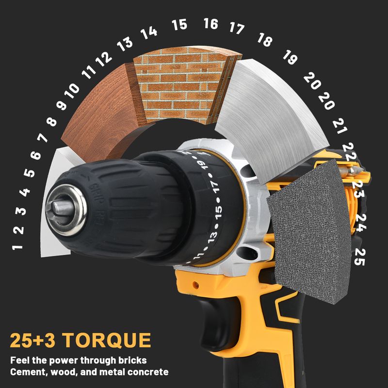 1. 25 + 3 stage settings, delivers 25 torque settings and 3 drill modes for high precision working