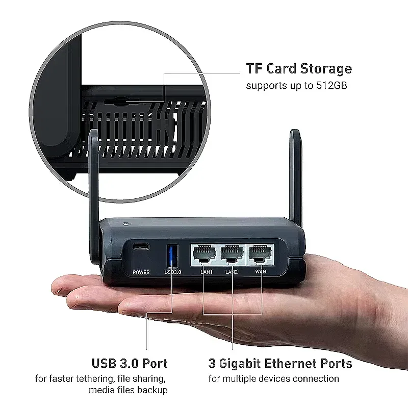 The device comes with a powerful CPU, Type-C power supply, USB 3.0 port, 3 gigabit ports, and a TF card slot that supports up to 512GB. Slate AX is ideal for file sharing and installing third-party applications that suit your needs.
