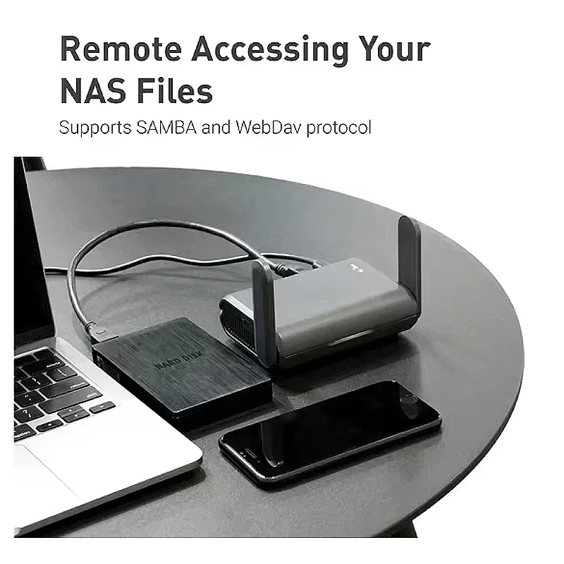 Our NAS feature supports SAMBA and WebDav protocol. By plugging an external USB hard disc into the router, you can create a private network to store and share your documents