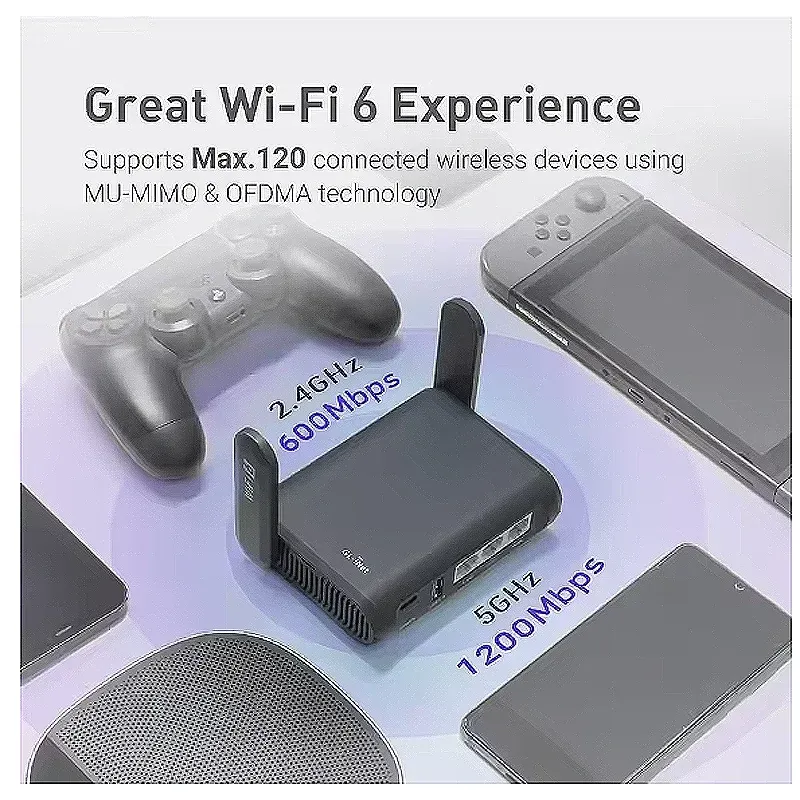 Slate AX offers powerful Wi-Fi 6 network connection with a dual-band combined Wi-Fi speed of 1800 Mbps (574 Mbps for 2.4GHz and 1201 Mbps for 5GHz). Enhance Wi-Fi performance with MU-MIMO, OFDMA, BSS color and able to connect to up to 120 devices simultaneously.