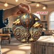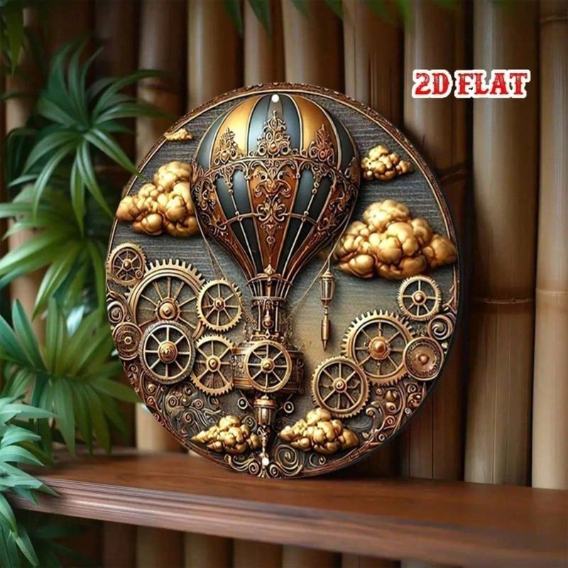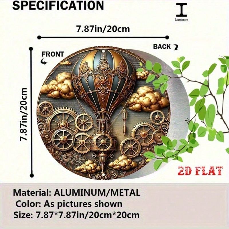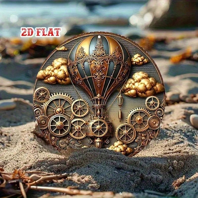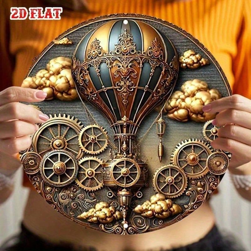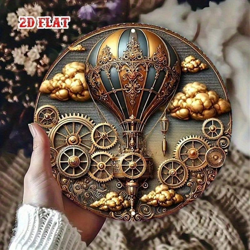 GlamourSteam Vintage Hot Air Balloon Wall Art, 7.87" Round Aluminum Steampunk Decor Metal Sign