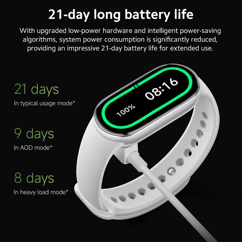 *Water-resistant to 50m: Based on the ISO 22810 First edition: 2010 test standard, the Xiaomi Smart Band 10 has been certified water-resistant by TÜV SÜD. Water resistance rating report number: 68.189.24.0798.01. Rated 5ATM water-resistant (equivalent to a submersed depth of 50 metres). This means it can be worn in swimming pools, while swimming near the shore and during other shallow water activities. It is not suitable for wearing in hot showers, saunas, or while diving. Make sure to avoid direct impacts from swift currents. Water resistance is not permanent and may reduce over time.