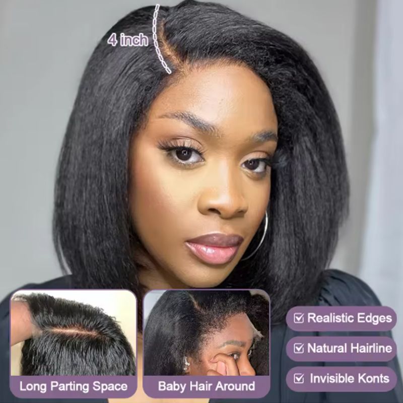 Glueless Kinky Straight Short Bob 100% Human Hair Wig 13x4 Frontal HD Transparent Lace Peruvain Remy Soft Yaki Wear And Go Wig