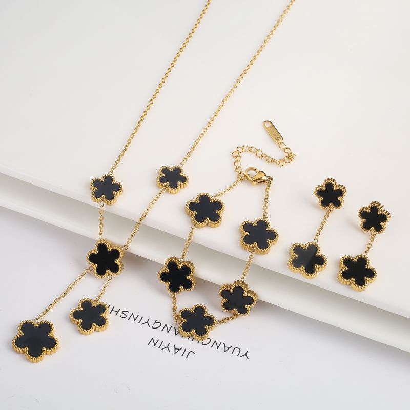 Name: Gold Plated Lucky Stainless Steel Five Leaf Flower 3PCS Jewelry Set Bracelet Necklace Earrings for Women Party Jewelry Clover