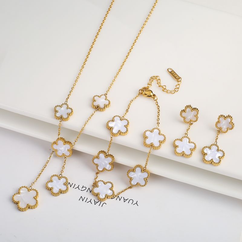 Name: Gold Plated Lucky Stainless Steel Five Leaf Flower 3PCS Jewelry Set Bracelet Necklace Earrings for Women Party Jewelry Clover