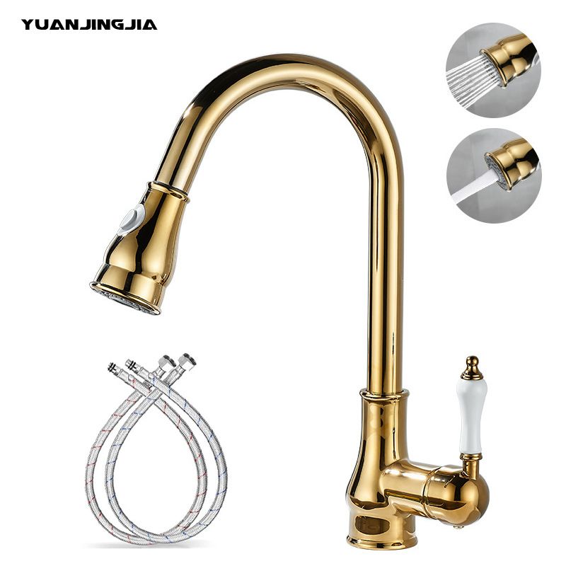 Golden Retro Brass Kitchen Pull-Out Faucet Home Sink Vegetable Washing Basin Rotating Three-Mode Hot & Cold Water Faucet