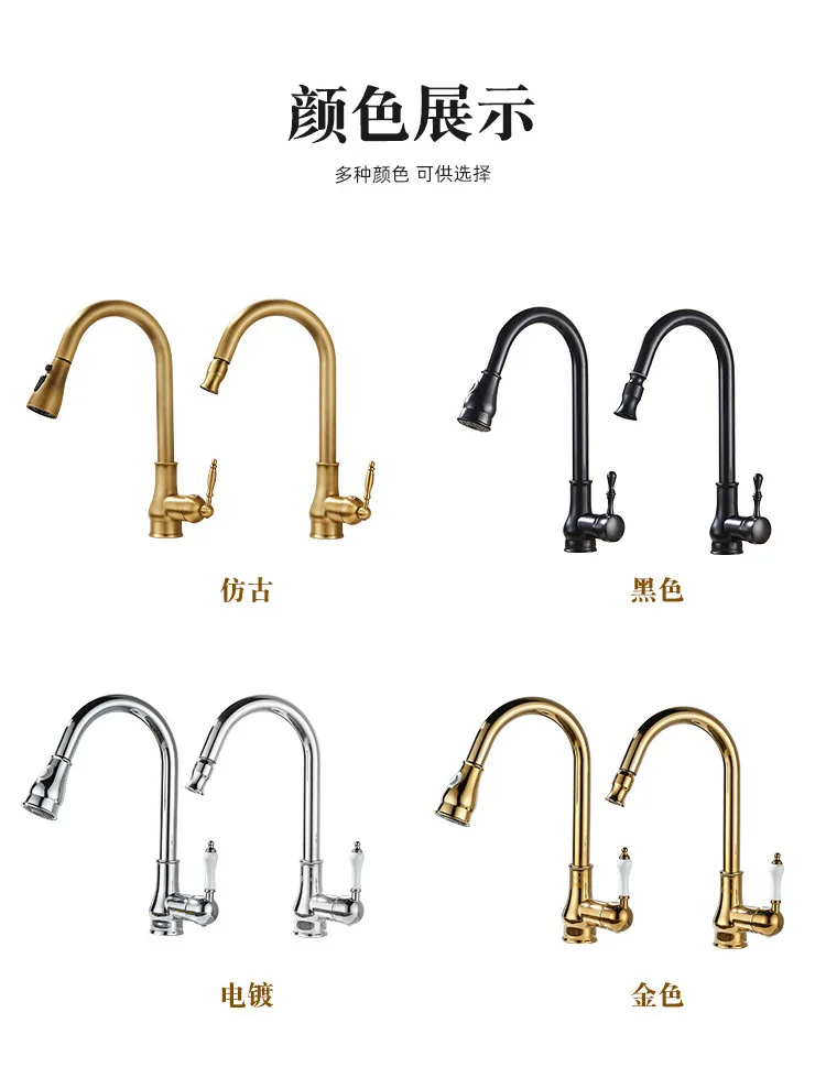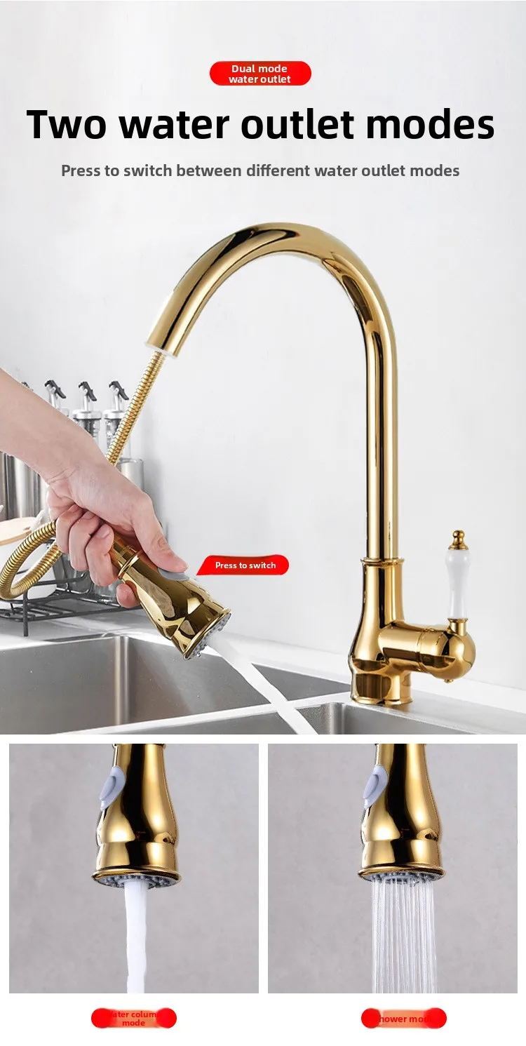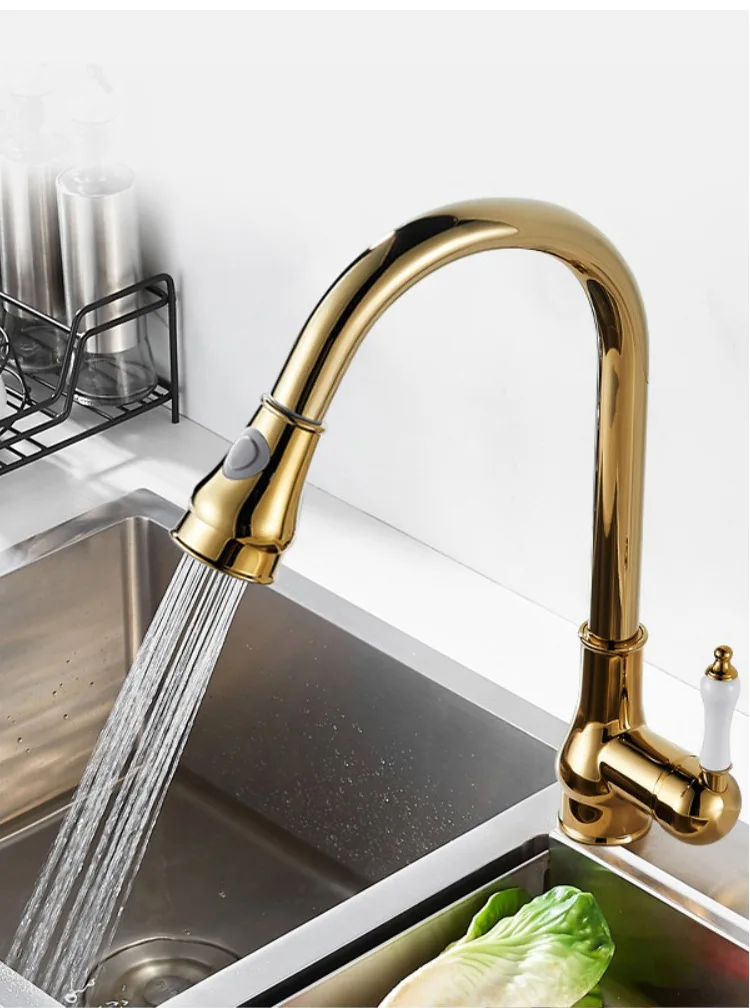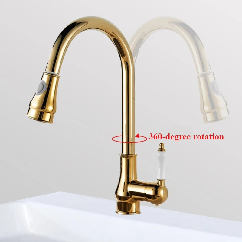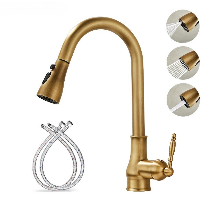 Golden Retro Brass Kitchen Pull-Out Faucet Home Sink Vegetable Washing Basin Rotating Three-Mode Hot & Cold Water Faucet