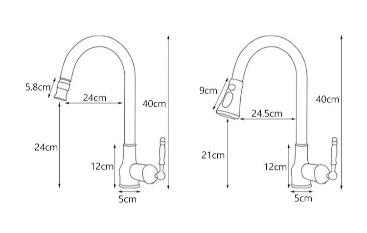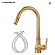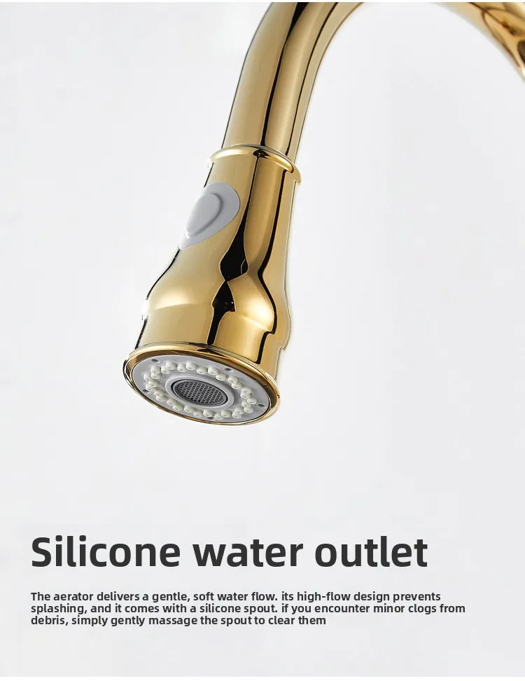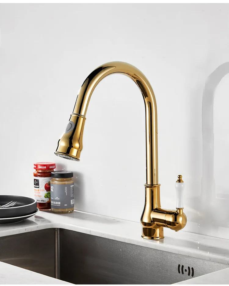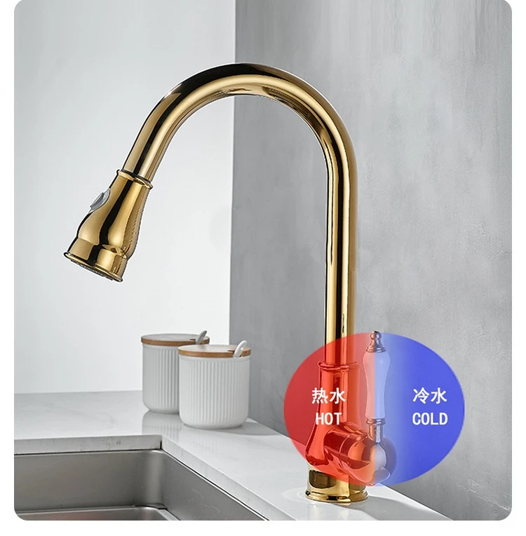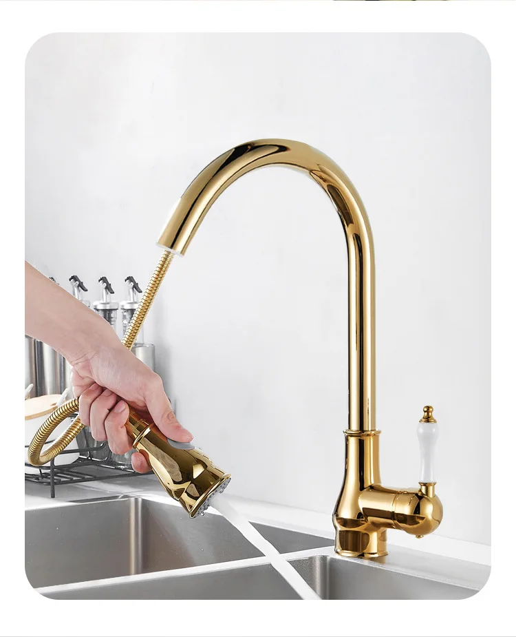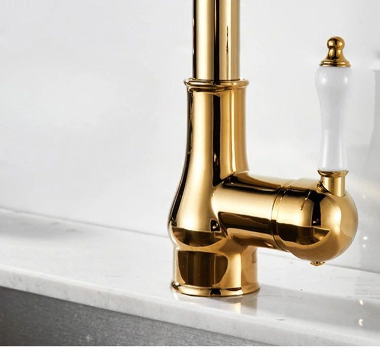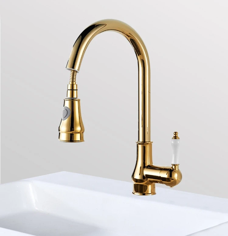 Golden Retro Brass Kitchen Pull-Out Faucet Home Sink Vegetable Washing Basin Rotating Three-Mode Hot & Cold Water Faucet