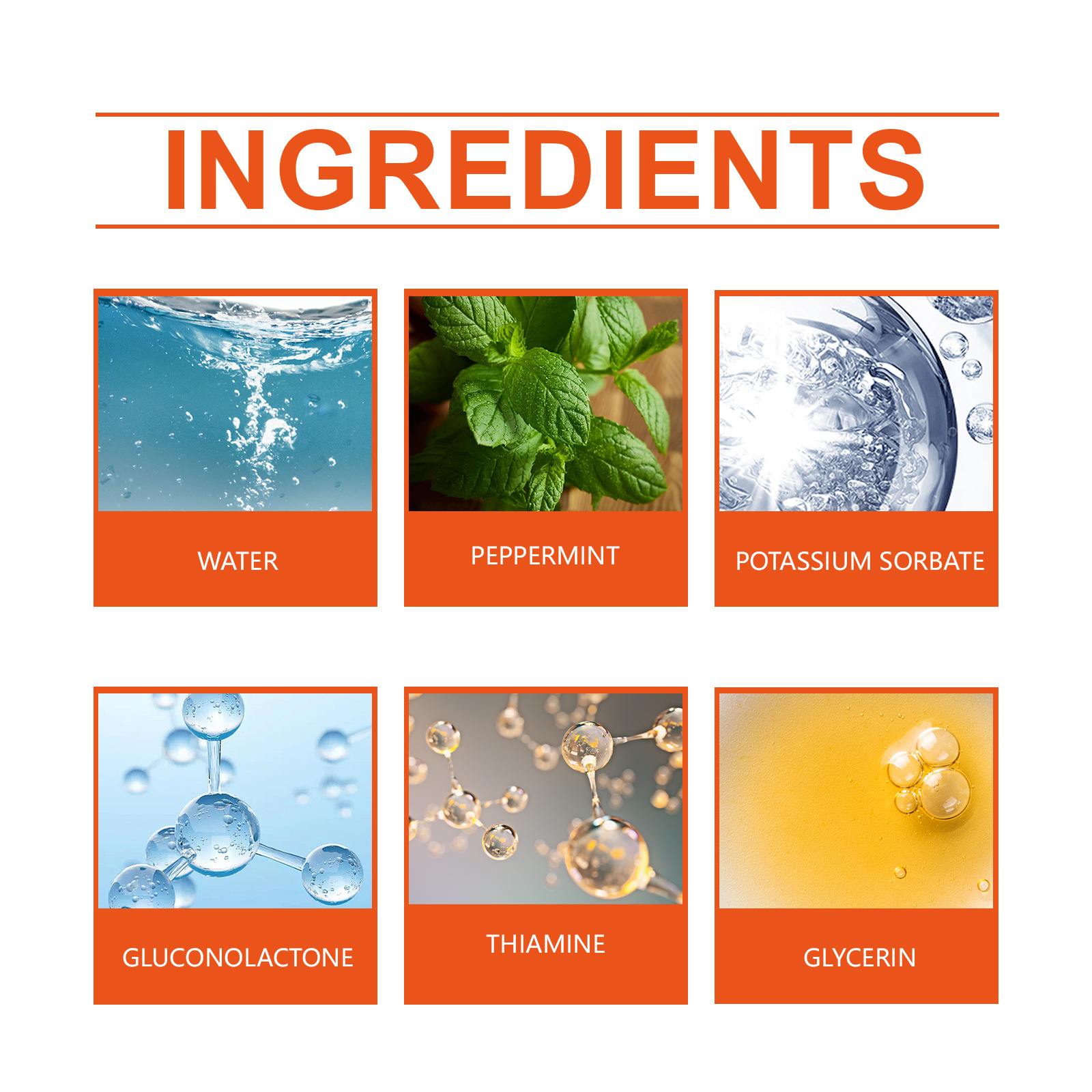 Product ingredients: Active ingredients: peppermint extract, vitamin B1 Non active ingredients: water, gluconic acid lipid, potassium sorbate, glycerol