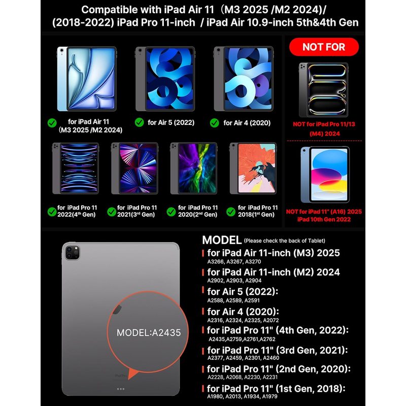 compatible with iPad Pro 11-inch (4th/3rd/2nd/1st gen) & iPad Air 10.9 “(5th/4th gen), iPad Air 11‘’ 2024 (M2),ipad Air 11'' 2025(M3)