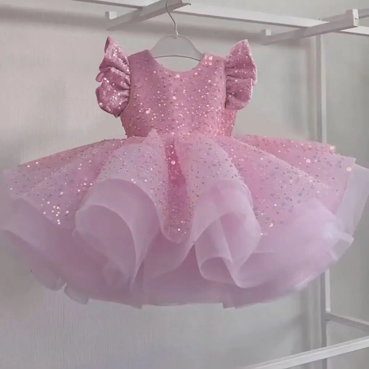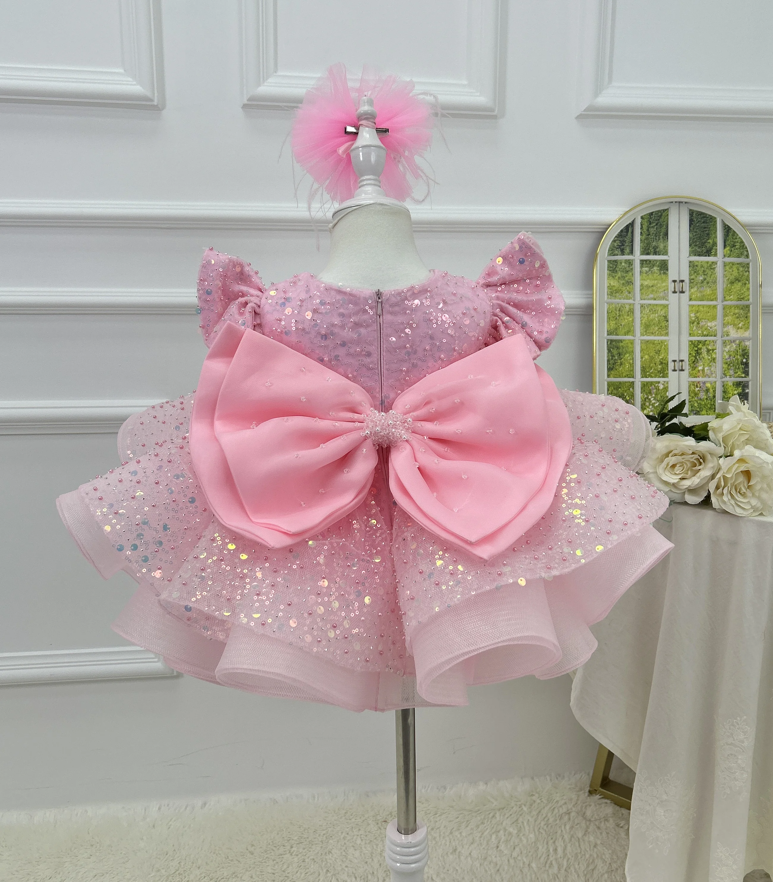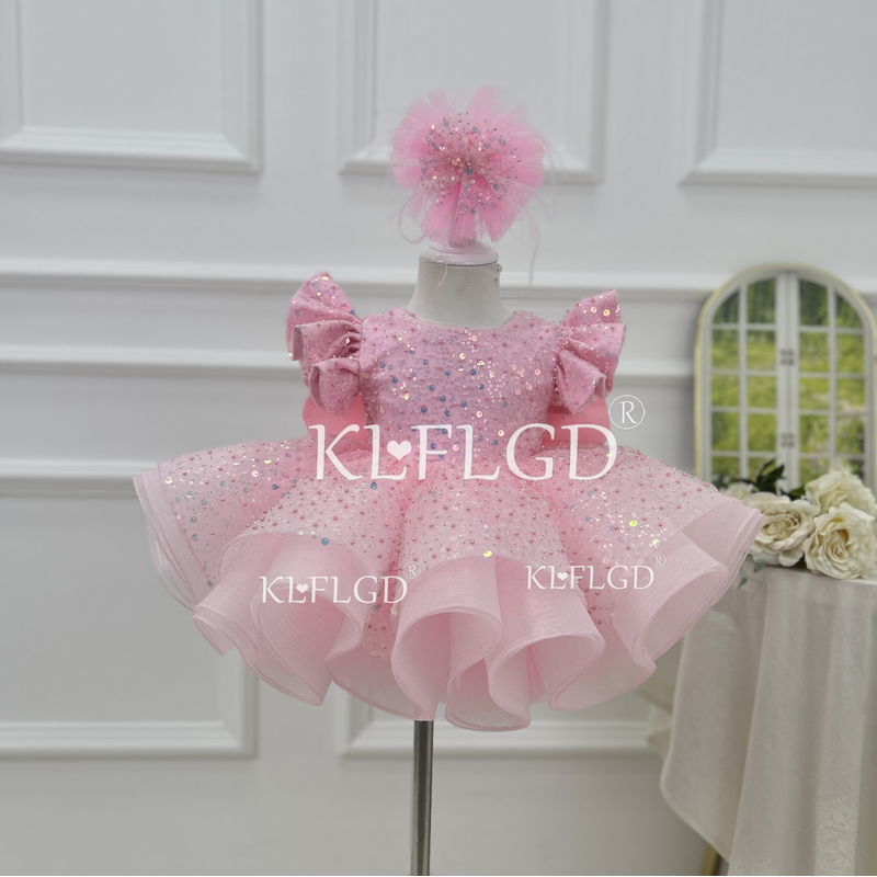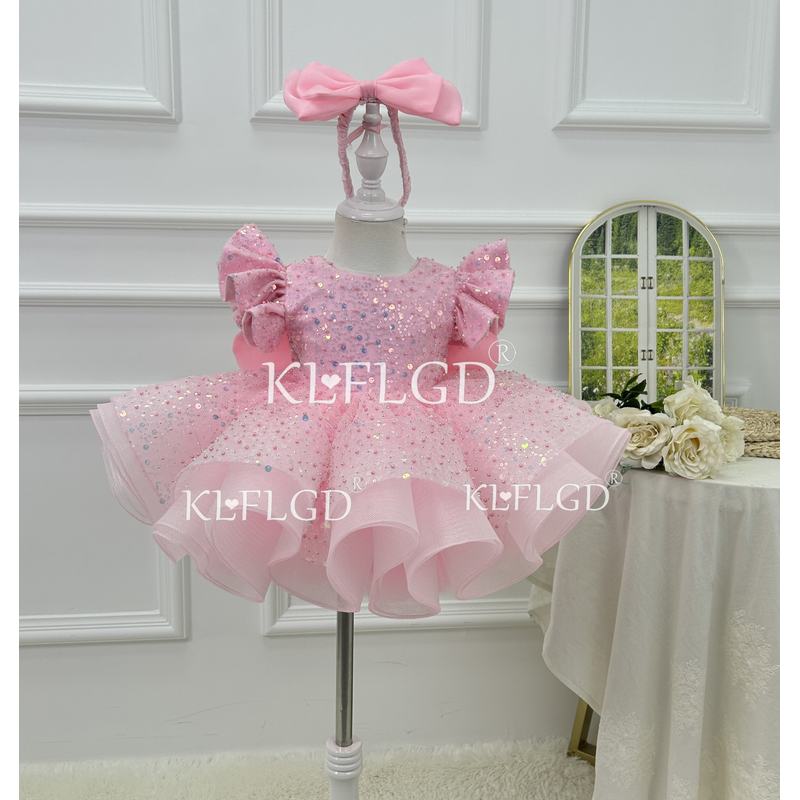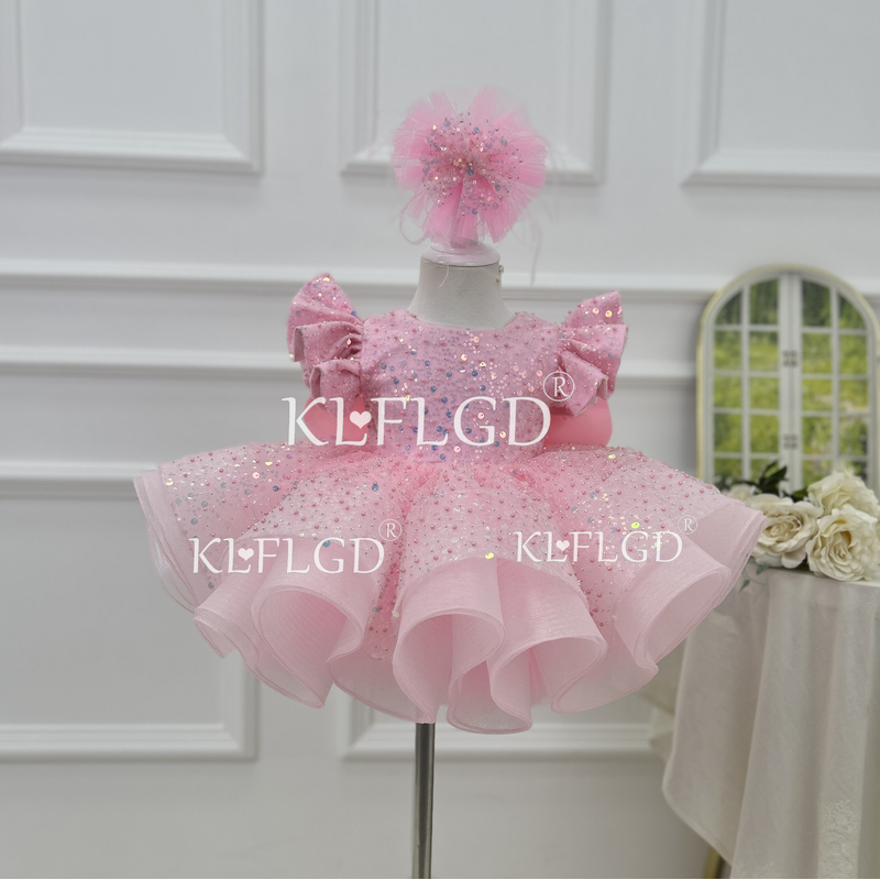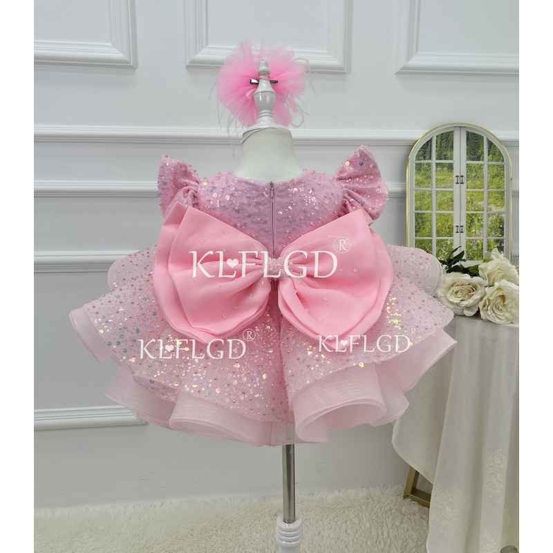 Gorgeous and elegant girl toddler dress sequin fly sleeve beauty pageant dress baby big bow one year birthday party costume