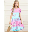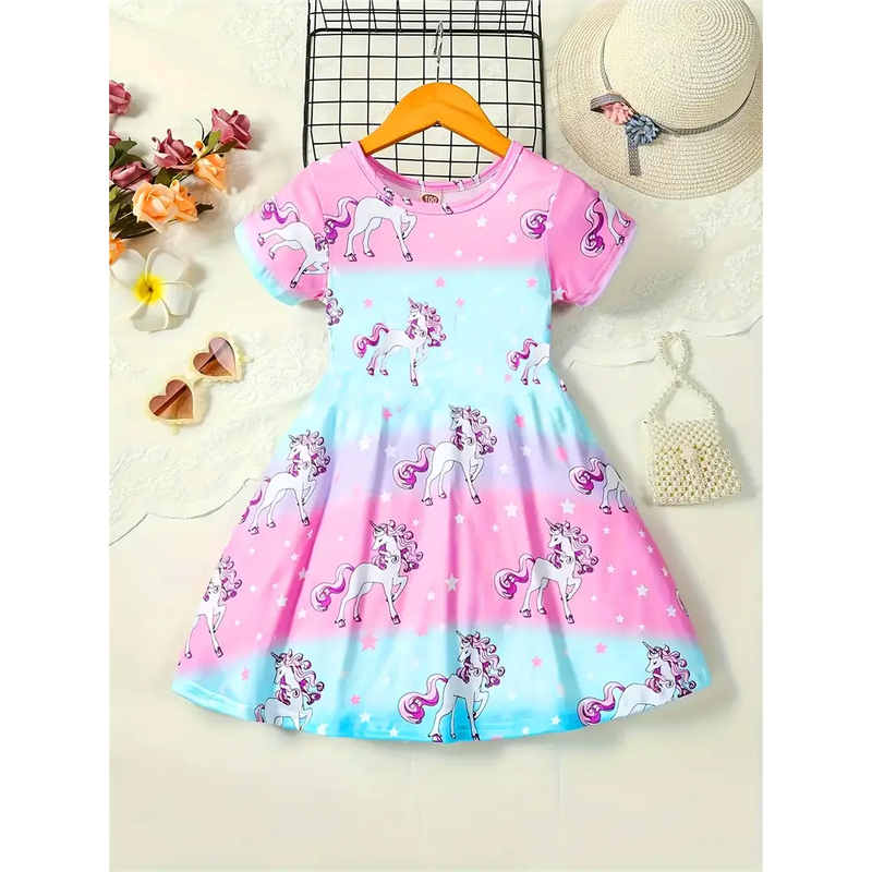 Gradient Color Unicorn Dress For Girls, Comfortable And Breathable Short-Sleeved Holiday Casual Dress