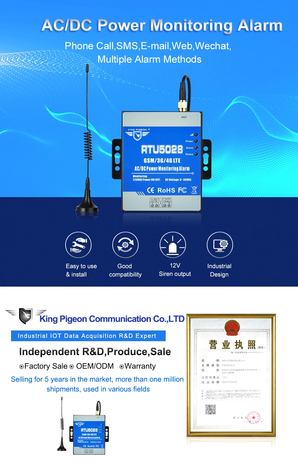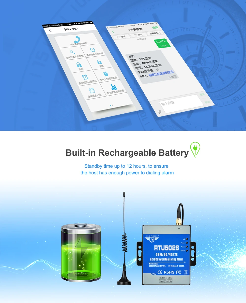 Just dial from Authorized User number, the GSM 3G 4G LTE AC/DC Power Monitoring Alarm will reject at the first “Ring”, no communication cost, and then return the current power status or voltage. Moreover, it can report onsite power status interval or daily.