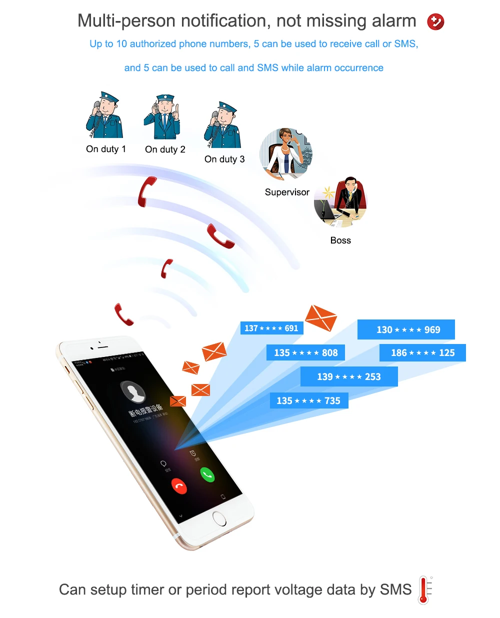 4. Up to 10 authorized phone numbers, 5 can be used to receive call or SMS,and 5 can be used to call and SMS while alarm occurrence;
