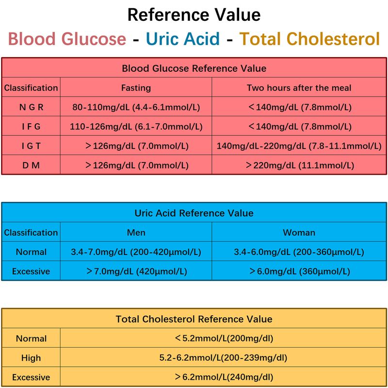 3 in 1 Multi-Function Meter. Tests multiple parameters with reliable test results, Including Blood Cholesterol Glucose Uric Acid.