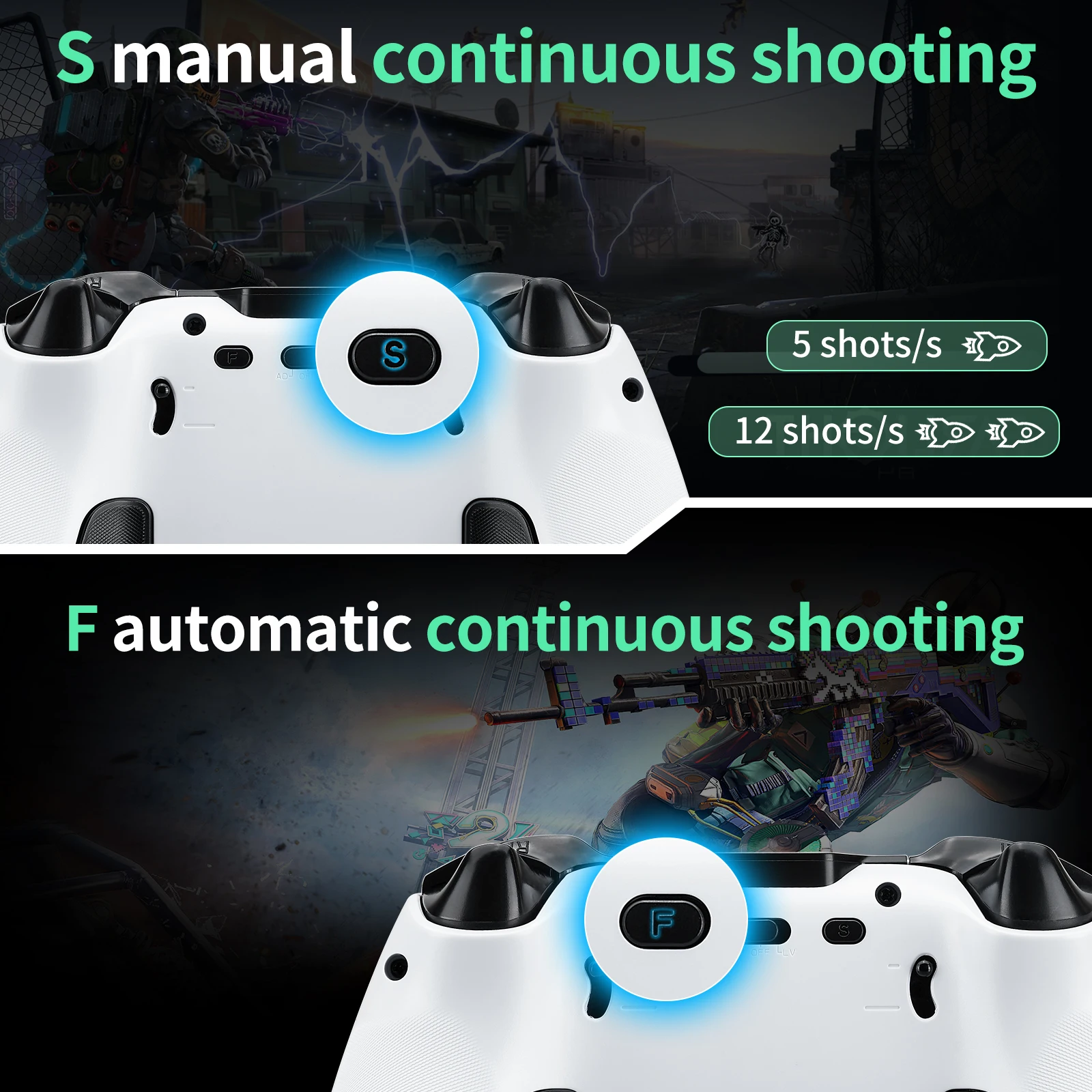 • Setting Method: Press S + Target Button once to enable semi-automatic rapid-fire for that button. Press S + Target Button again to disable the function.