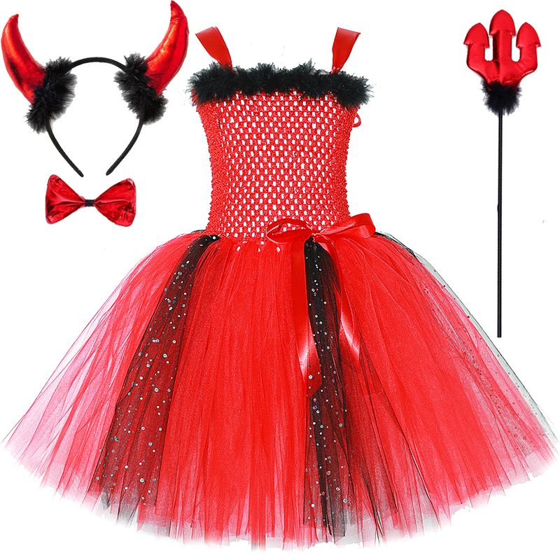 Halloween Red Devil Costumes for Girls Demon Angel Fancy Tutu Dress with Wings Horn Pitch Fork Kids Carnival Disguise Outfits