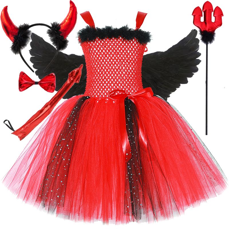 Halloween Red Devil Costumes for Girls Demon Angel Fancy Tutu Dress with Wings Horn Pitch Fork Kids Carnival Disguise Outfits