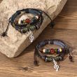 Handmade Hippie Design Brown Leather Bracelet Women Metal Star Note Charms Wood Button Beads Wrap Unisex Adjustable Bracelet