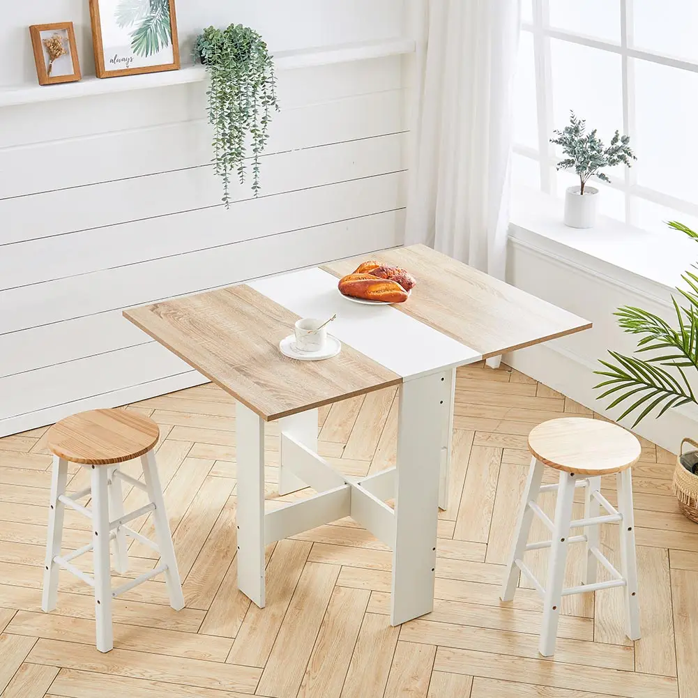 Make large unused tables at home a thing of the past. Choose this Haodirect drop leaf dining table for extending surface space. Both sides lift up and drop down super easily, which comes in handy when you have guests over for dinner or need more surface for prepping. It can also be an amazing side table or computer desk, just fold down the leaf and have it settled in the living room or entryway. Constructed from strong particleboards and heavy-duty hardware, the table guarantees a delightful user experience.