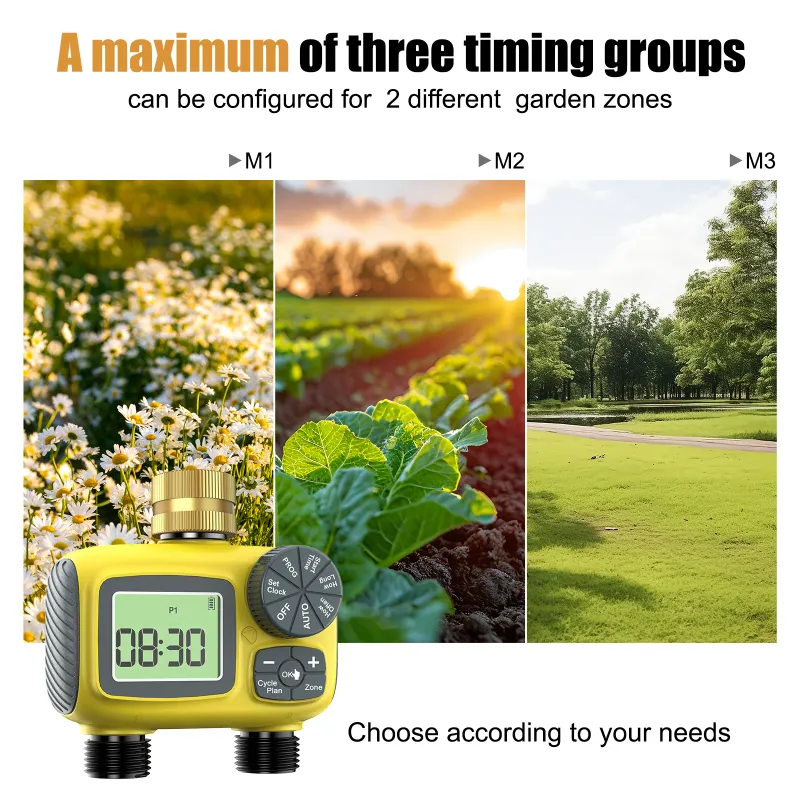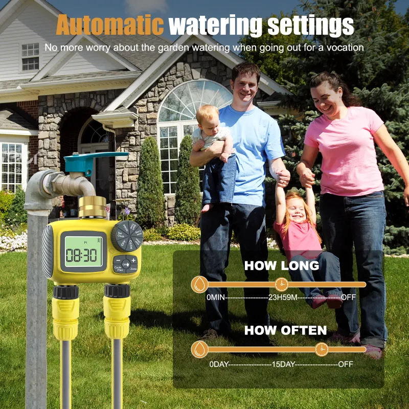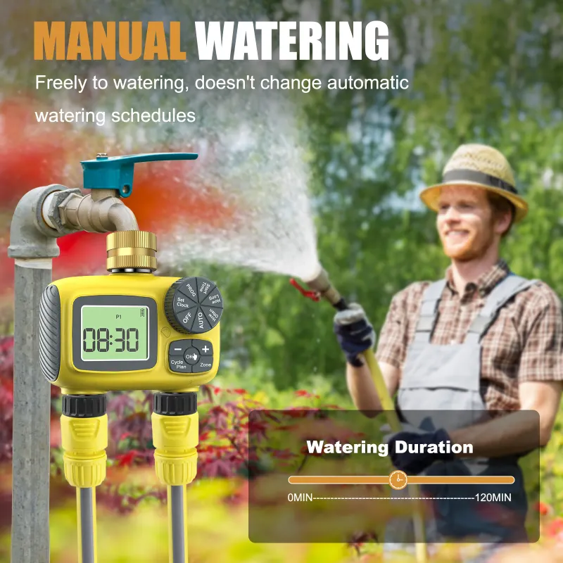 Upgrade your garden care with Garden Watering Timer, featuring dual programmable zones, automatic watering, rain delay mode, and three manual watering modes. With a durable design, easy-to-read LED display, and low battery alert, enjoy worry-free garden maintenance.