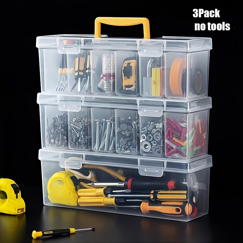 Household multi-functional hardware tool box, transparent portable tool storage box, wrench, screw, and parts organizer.