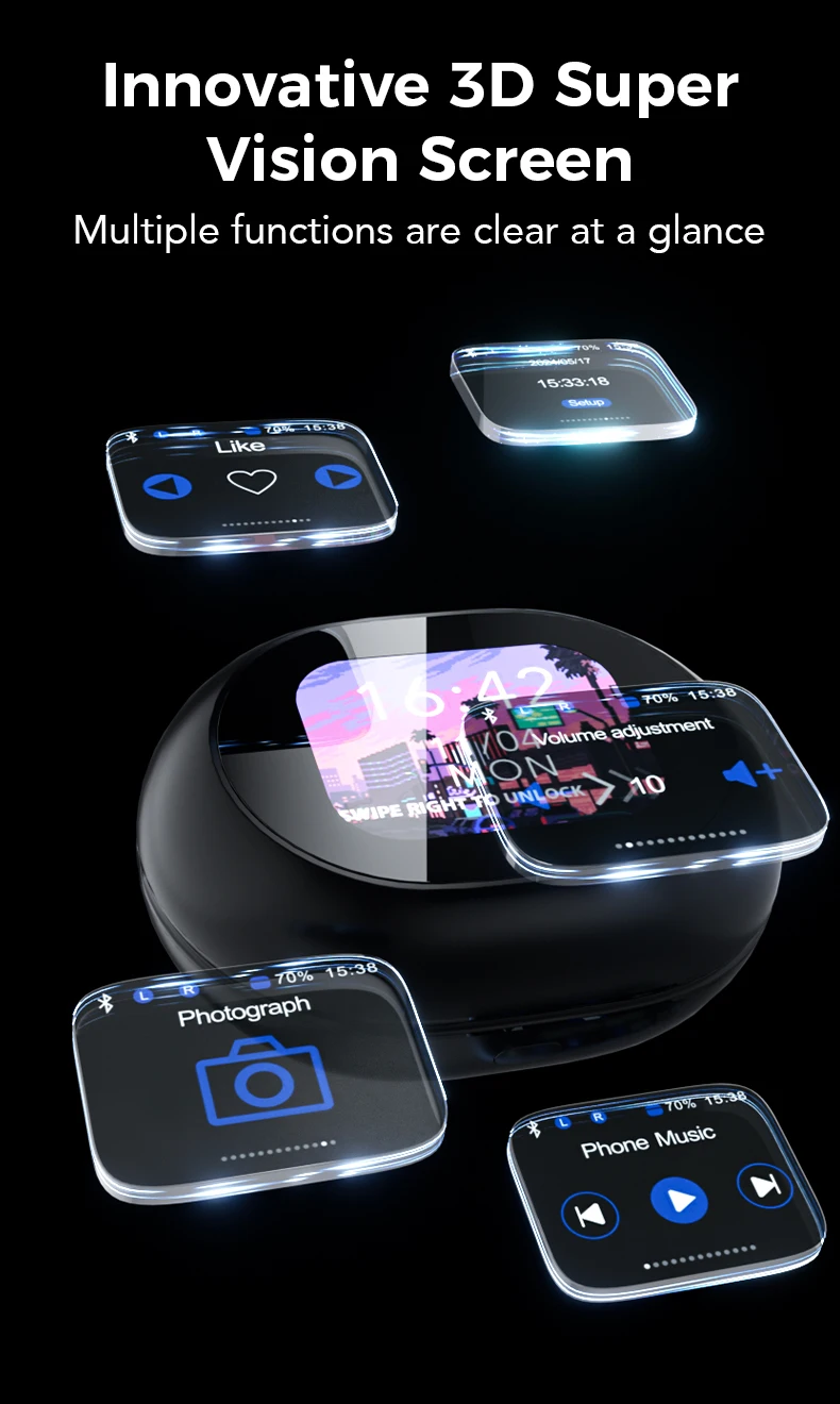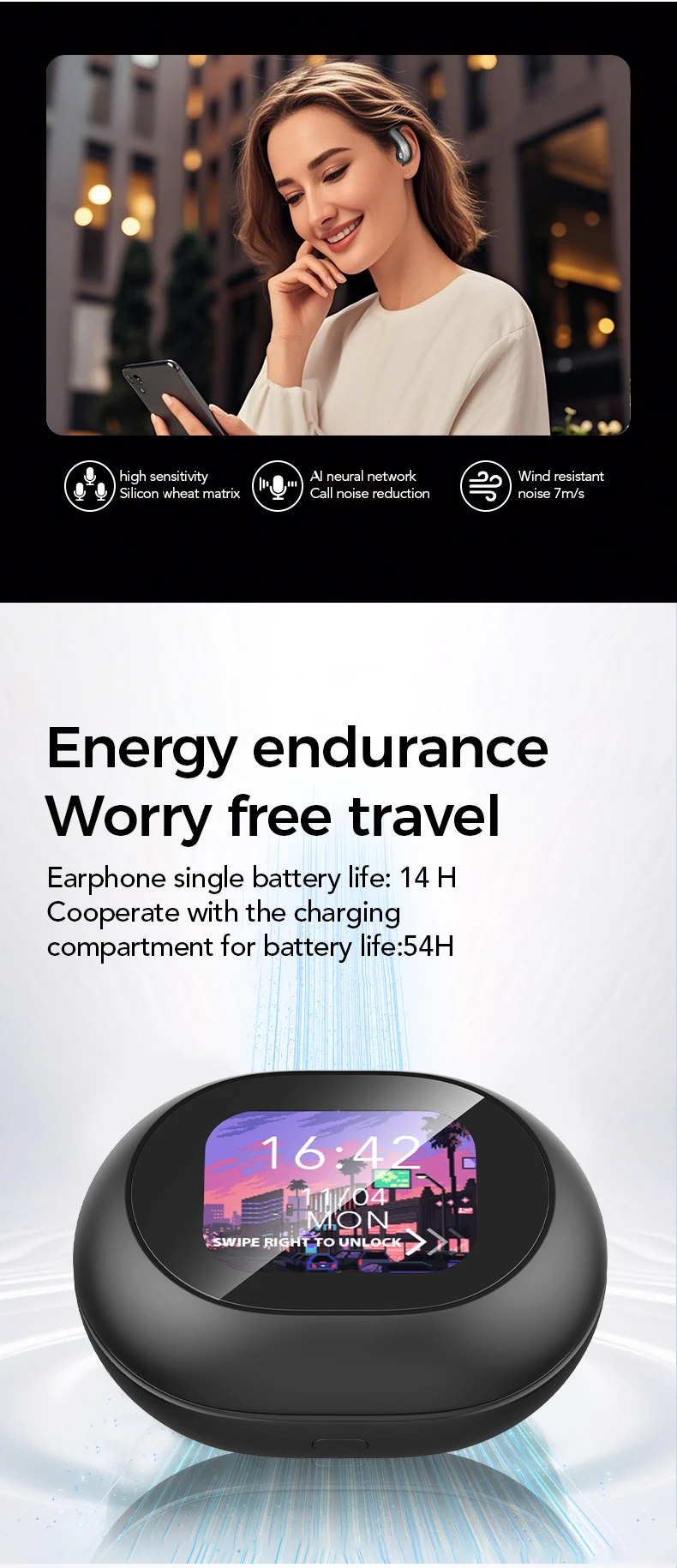 Real-time display of battery level, time, and weather. Supports custom wallpapers and theme switching, transforming the earbud case into a portable smart terminal.