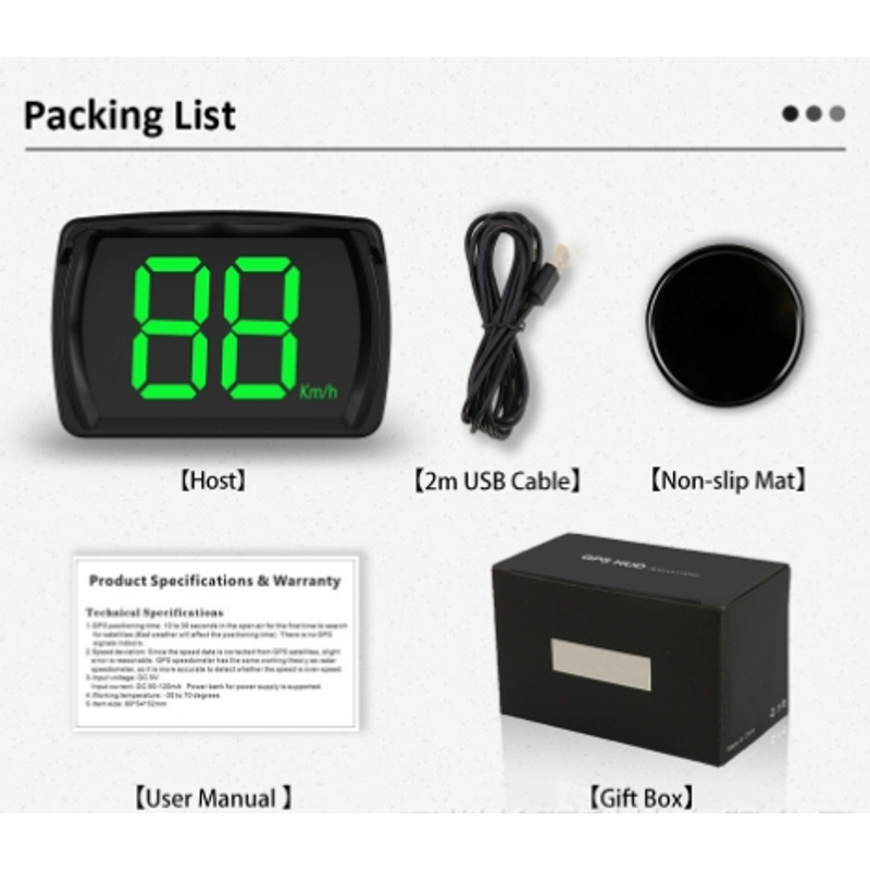 Speedometer * 1+USB Cable * 1+Non slip Mat * 1+Instruction manual * 1+Packaging box * 1