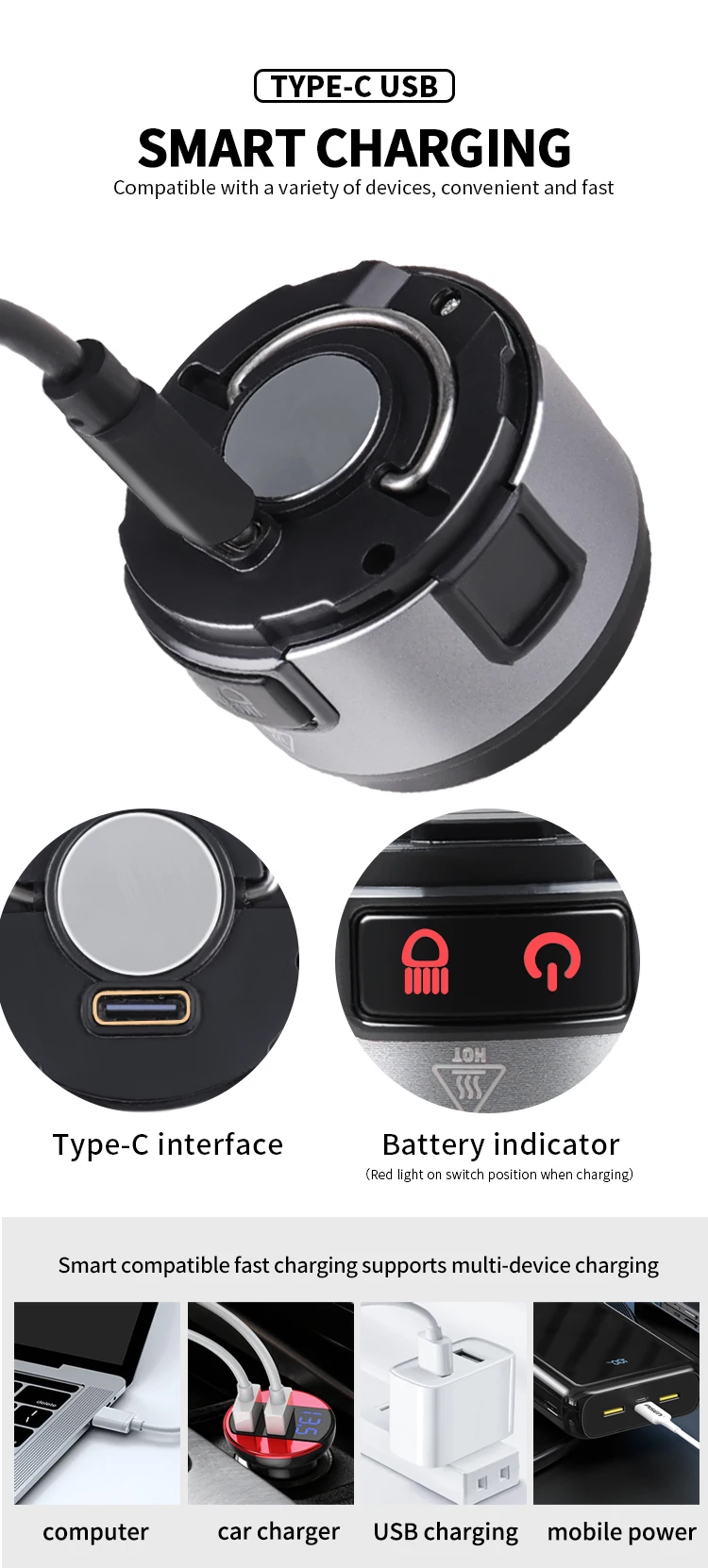 Indicator light: low battery reminder. The switch position indicator light is red when charging. The indicator light is green when fully charged and in use.